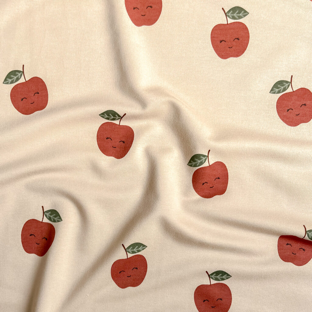 De combinatie van het neutrale beige en het speelse rood maakt deze stof veelzijdig én uniek. Of je nu een trui, babysetje of jurkje maakt – deze appelstof geeft elk project een vrolijke twist.