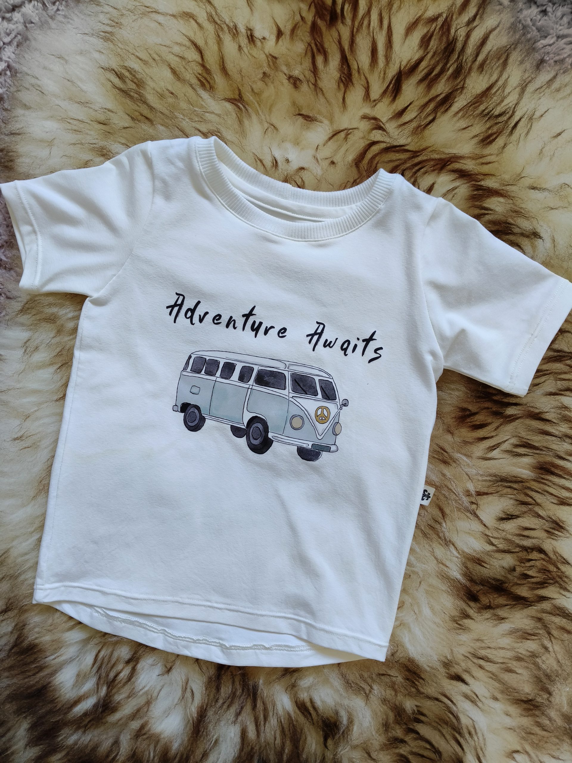 Breng een vleugje vrijheid en avontuur naar kinderkleding met onze unieke transfer! Deze stijlvolle print toont een iconisch VW camperbusje, perfect voor jonge dromers en kleine ontdekkingsreizigers. De speelse illustratie wordt compleet gemaakt met de inspirerende tekst “Adventure Awaits” – een uitnodiging om de wereld te ontdekken, elke dag opnieuw. Match hem met de te gekke camperbusjes stoffen van de beachboy collectie