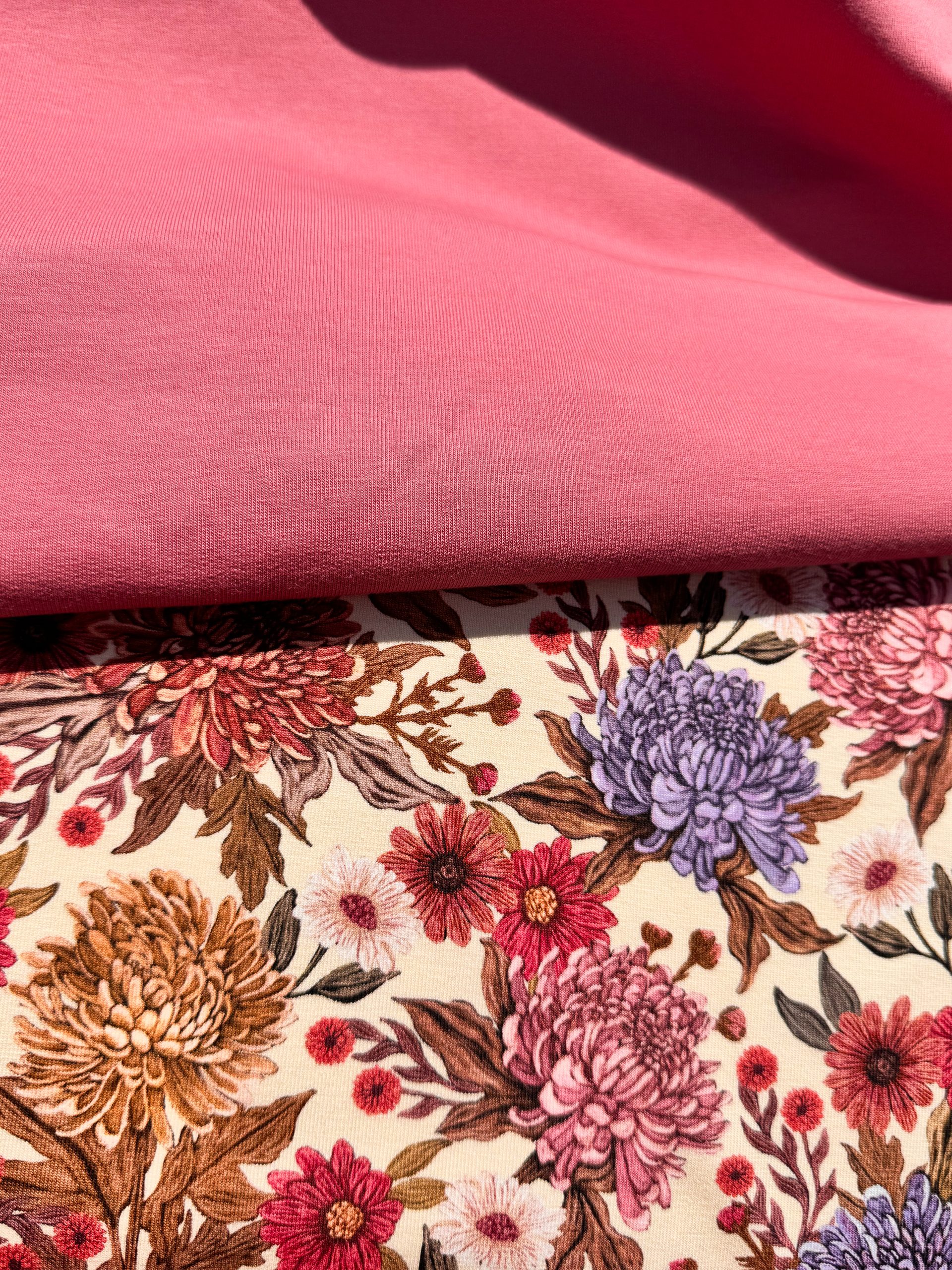 Breng de warmte van het najaar in je garderobe met onze Autumn Blooms-print op zachte reactieve jersey. Deze soepele, rekbare tricotstof voelt heerlijk comfortabel aan en is ideaal voor T-shirts, jurken, rokken en kinderkleding. Dankzij de reactieve druktechniek blijven de kleuren levendig, was na was, en komt het rijke bloemenmotief prachtig tot leven.