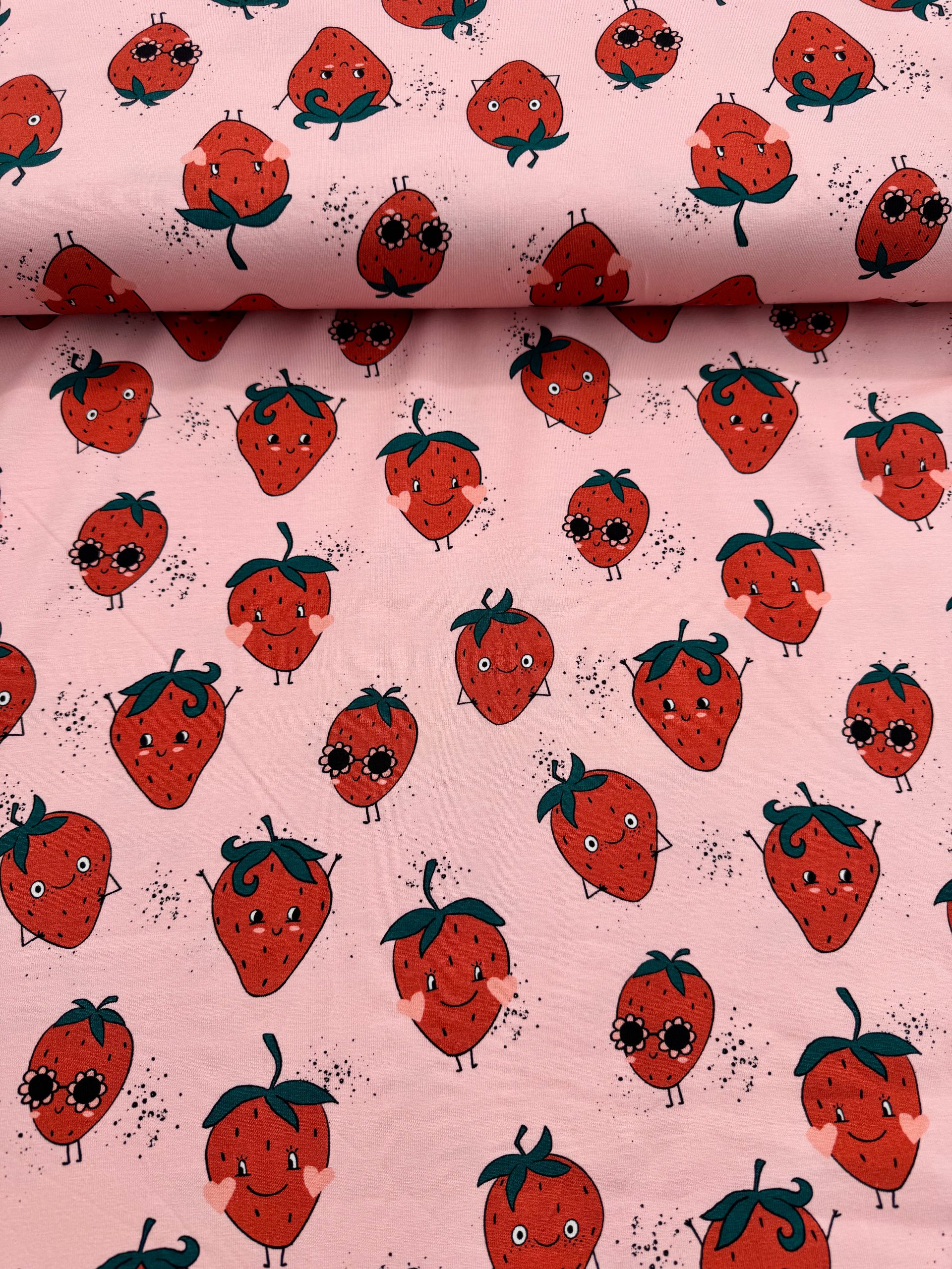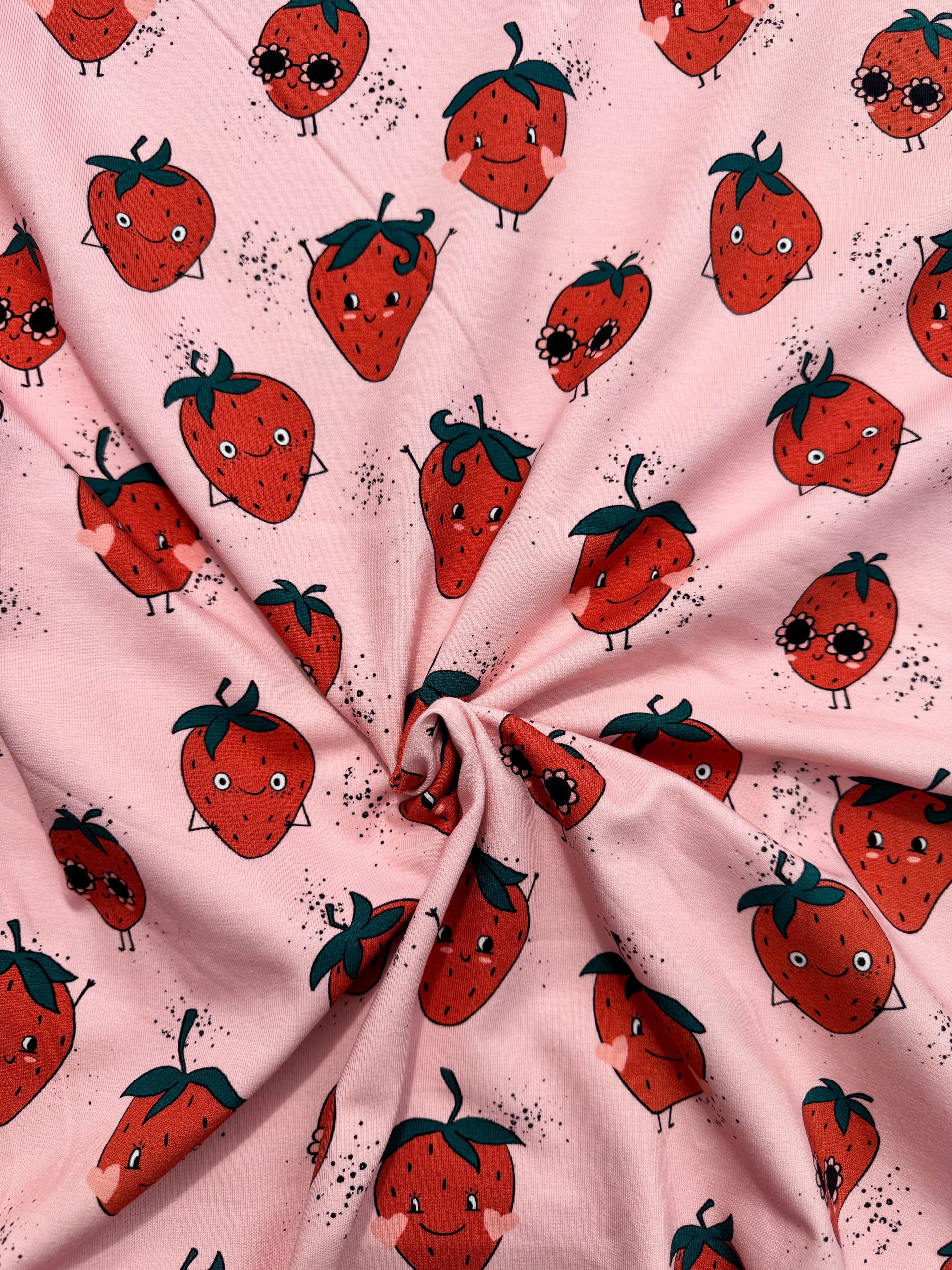 Onze Berry Cute jersey doet haar naam eer aan: dit is fruit op z’n allerliefst. Schattige aardbeitjes met gezichtjes zorgen voor een vrolijke, speelse uitstraling die zowel kinderen als volwassenen zal doen glimlachen. De kleuren zijn zacht en fris, perfect voor lente- en zomerkleding.
