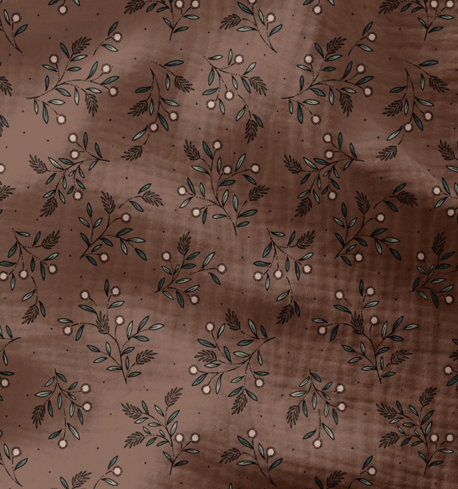 Breng warmte en natuurlijke charme in je creaties met onze double gauze in een diepe bruine tint, versierd met een elegant bladerenmotief. De dubbelgeweven katoenen stof voelt heerlijk zacht aan, is ademend en heeft het karakteristieke nonchalante kreukeffect waardoor strijken overbodig is. Perfect voor jurken, blouses, babykleding of accessoires met een rustige, botanische uitstraling.