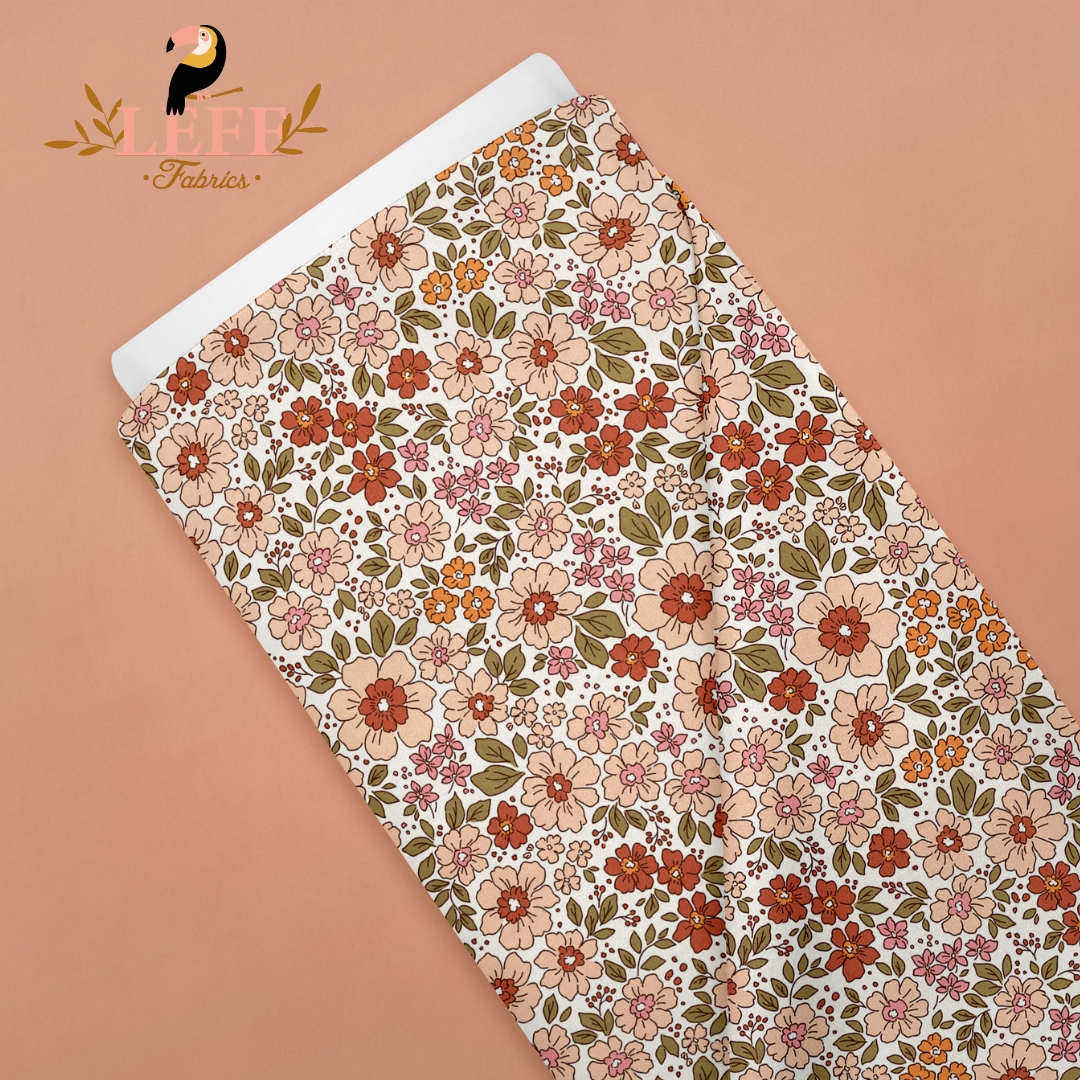 Katoen is ademend, zacht en veelzijdig, waardoor deze stof zowel geschikt is voor warme zomerdagen als voor laagjes in het voorjaar. De subtiele bloesems voegen een verfijnde charme toe aan je ontwerpen, zonder dat ze te aanwezig zijn.