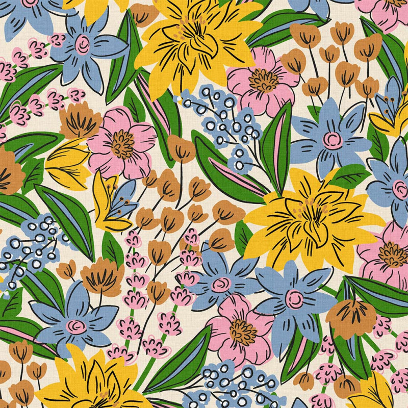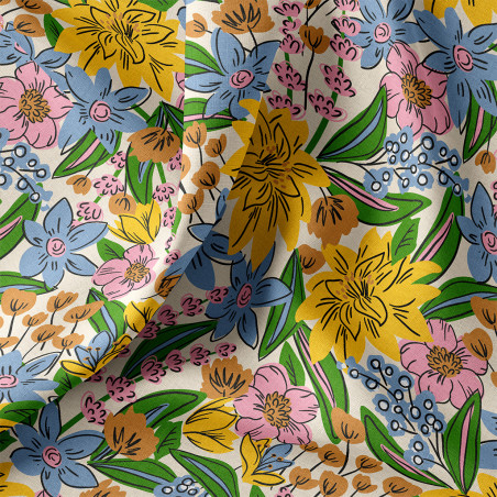 Met Bloom Party katoen haal je een vrolijke, veelzijdige bloemenstof in huis die perfect past bij lente- en zomercollecties en elk naaiproject laat stralen.