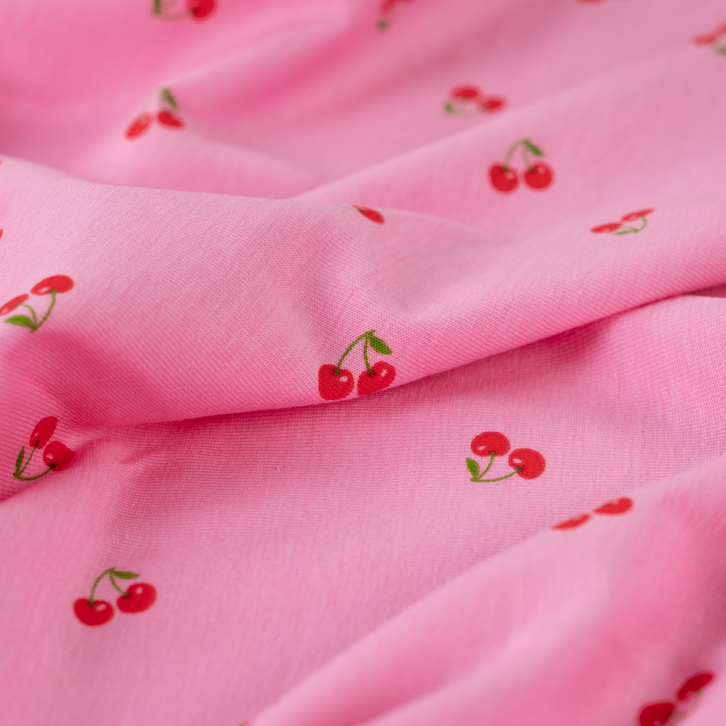 Deze roze jersey met rode kersjes is een vrolijke en speelse stof met een frisse, zomerse uitstraling. De zachte roze basis gecombineerd met kleine rode kersjes geeft het dessin een lieve en retro geïnspireerde look.