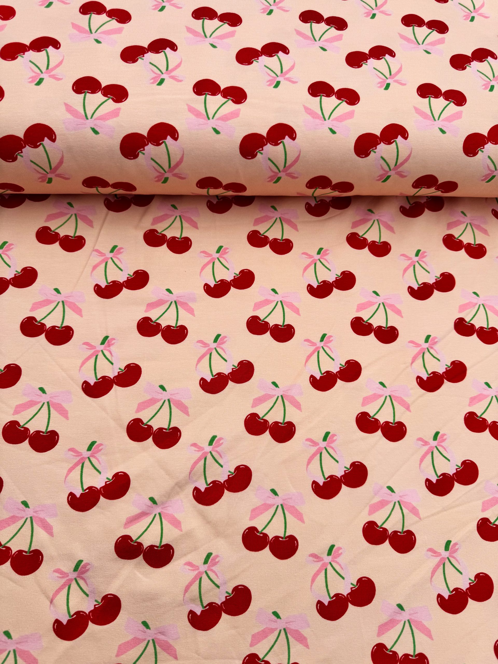 Onze Cherry Cute jersey is alles wat de naam belooft: speels, lief en onweerstaanbaar schattig. De kersjes zijn nét wat extra aangekleed met kleine strikjes, wat deze print een tikje retro én helemaal uniek maakt. Een perfecte mix van zoet en stijlvol – ideaal voor kleine fashionista’s (en grote ook 😉).