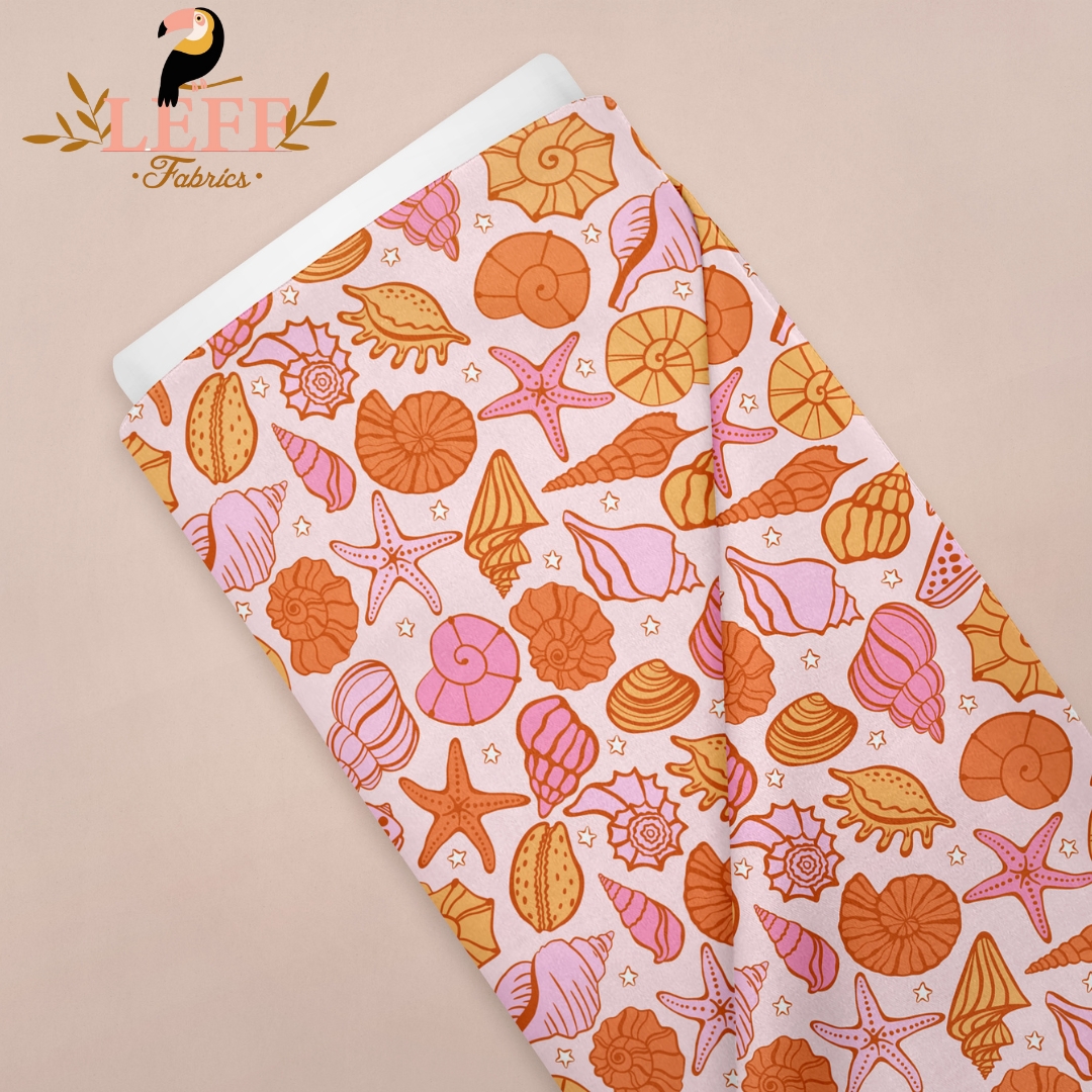 Breng een vrolijke, zomerse sfeer in je kleding met onze colourful shells print op zachte, rekbare jersey stof. Perfect voor T-shirts, jurkjes, babykleding en andere comfortabele kledingstukken die veel beweging vragen.