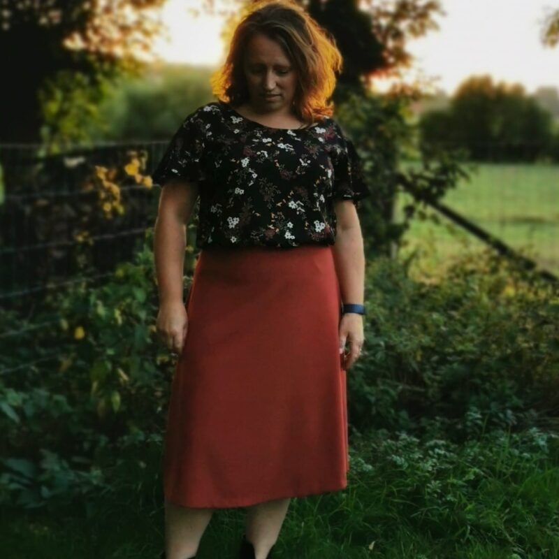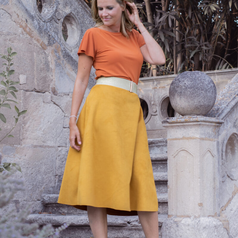 De Cora rok werd getekend voor rekbare stoffen die mooi doorvallen, denk daarbij aan iets dikkere tricot, punta di roma, suede, scuba,…