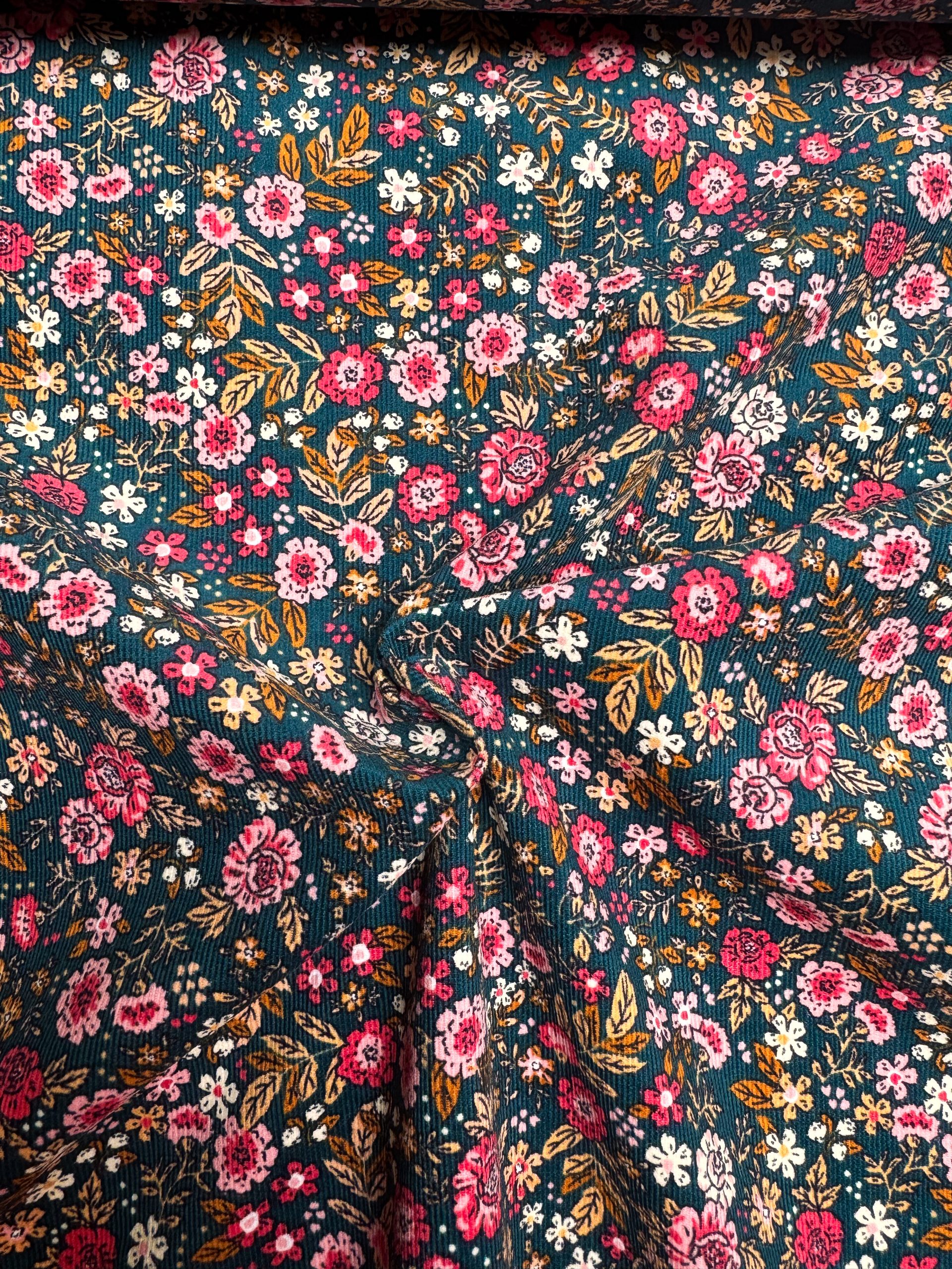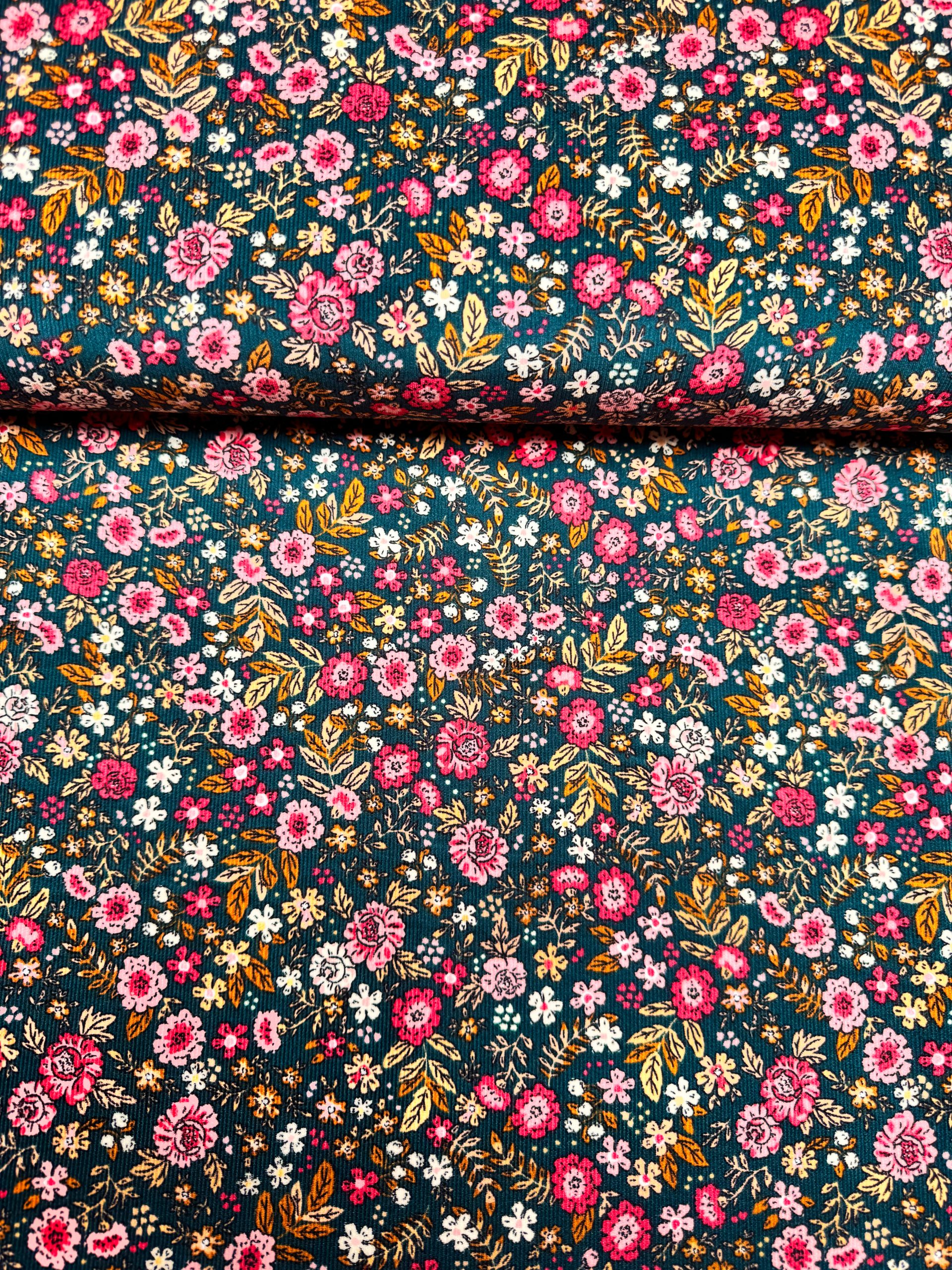 Deze vintage bloemenstof op een rijke smaragdgroene achtergrond ademt elegantie en nostalgie. De bloemen, uitgevoerd in warme, klassieke tinten, komen prachtig tot hun recht tegen de diepe, levendige groene basis, wat zorgt voor een chique en tijdloze uitstraling.