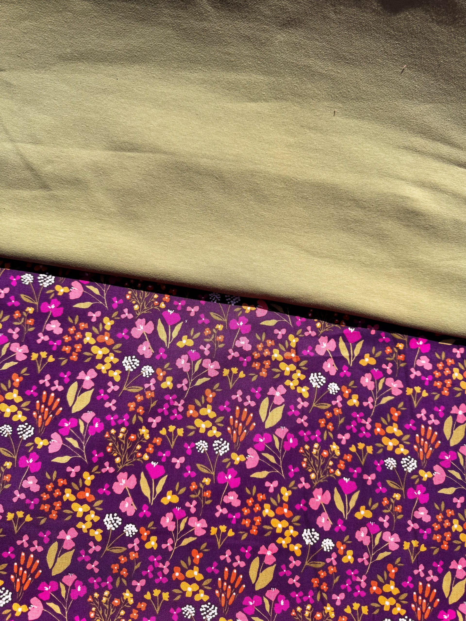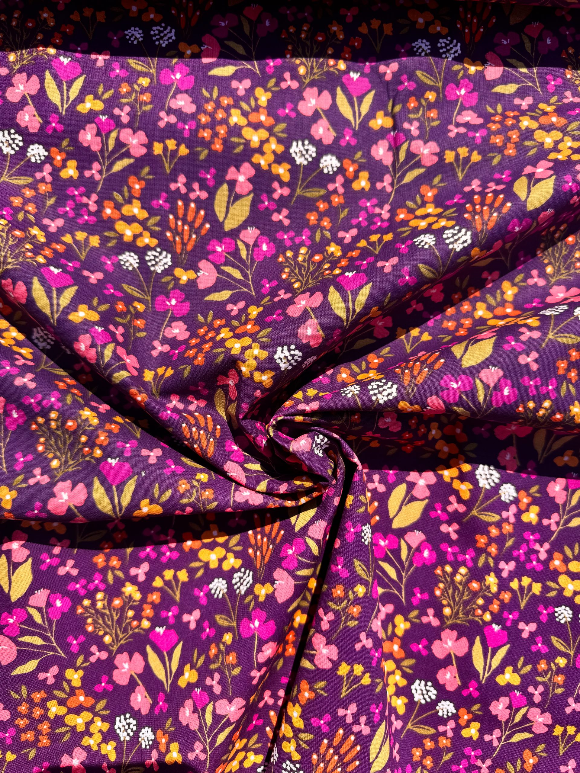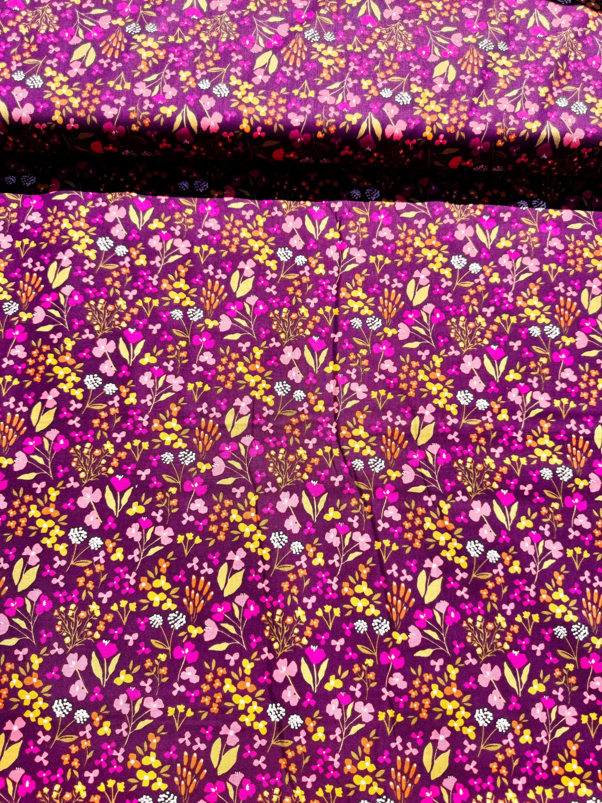 Deze bloemenstof op een diepe paarse ondergrond is een echte blikvanger. De bloemen in zonnig geel, fris groen en fel roze zorgen voor een levendig contrast dat meteen in het oog springt. De combinatie van de rijke achtergrondkleur met de heldere bloemaccenten geeft de stof een speelse, maar ook chique uitstraling.