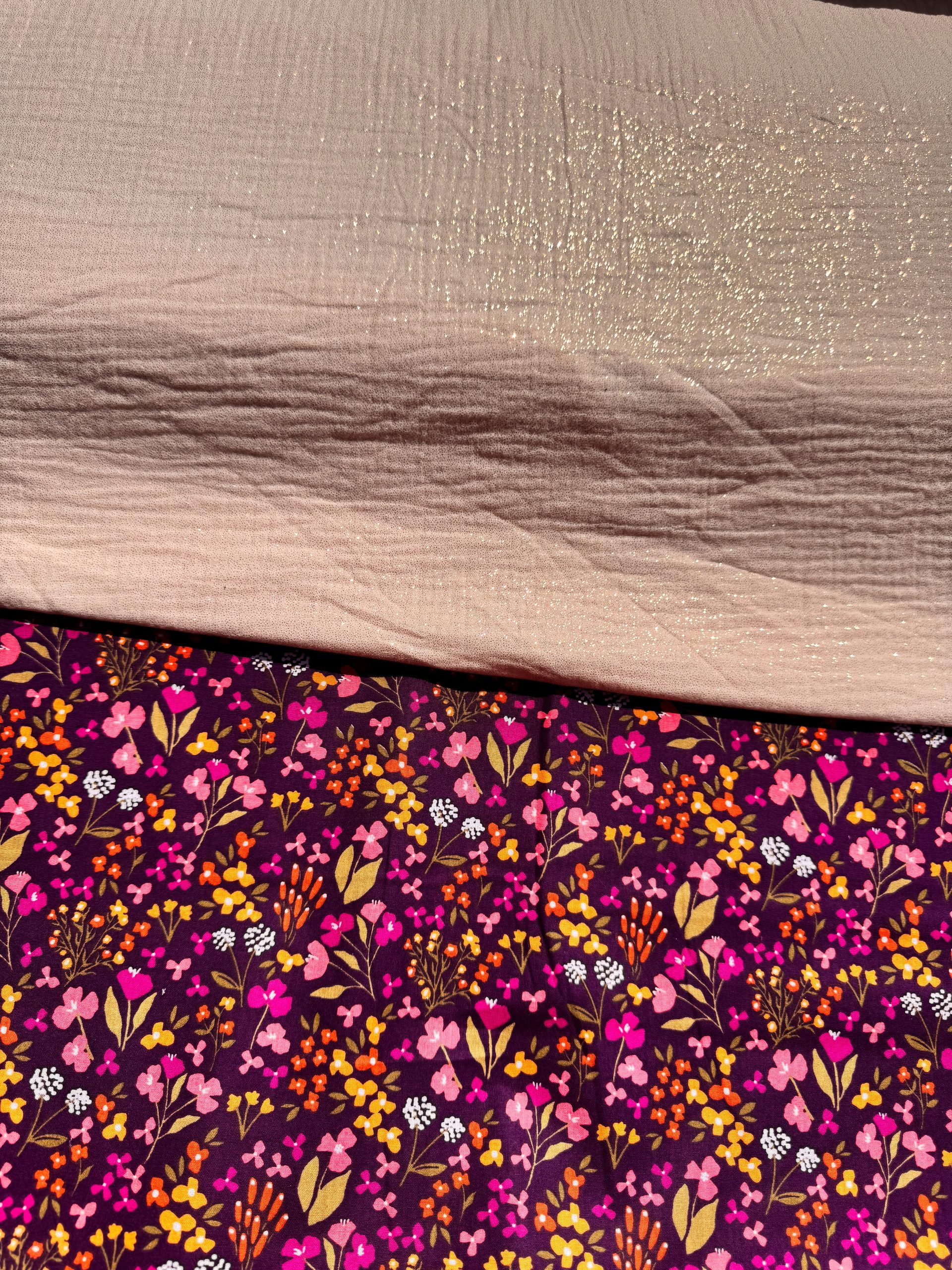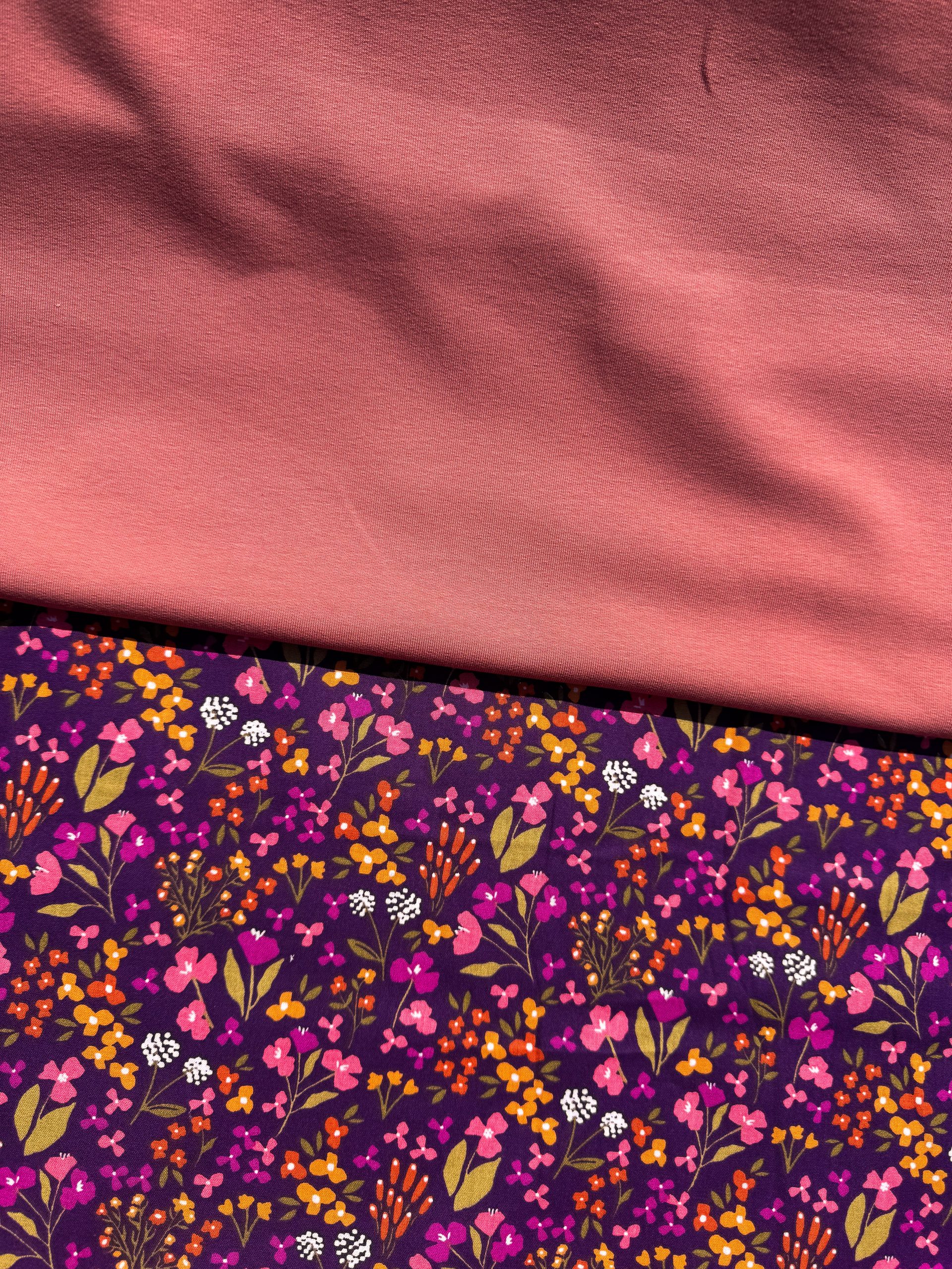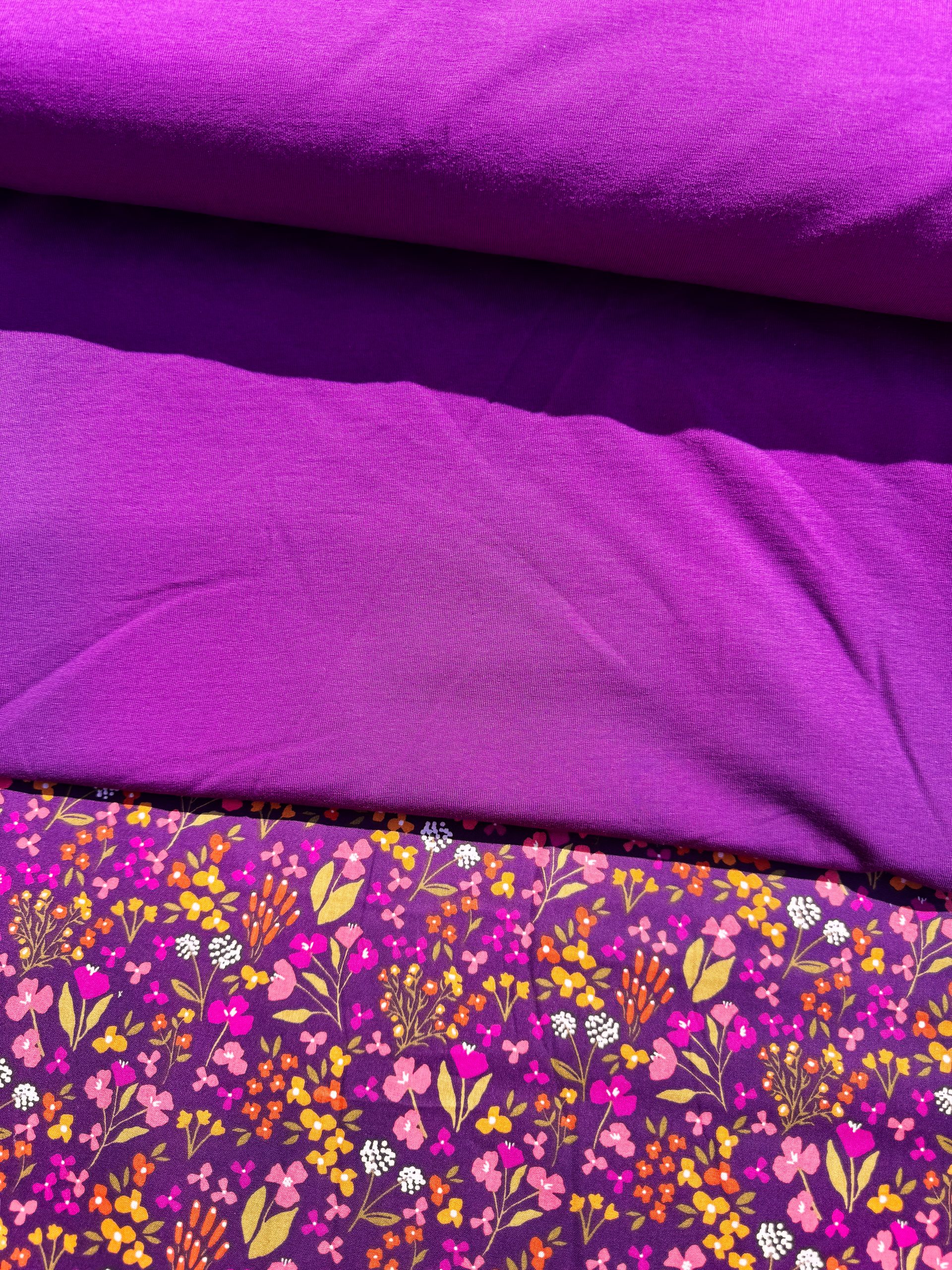 Deze bloemenstof op een diepe paarse ondergrond is een echte blikvanger. De bloemen in zonnig geel, fris groen en fel roze zorgen voor een levendig contrast dat meteen in het oog springt. De combinatie van de rijke achtergrondkleur met de heldere bloemaccenten geeft de stof een speelse, maar ook chique uitstraling.