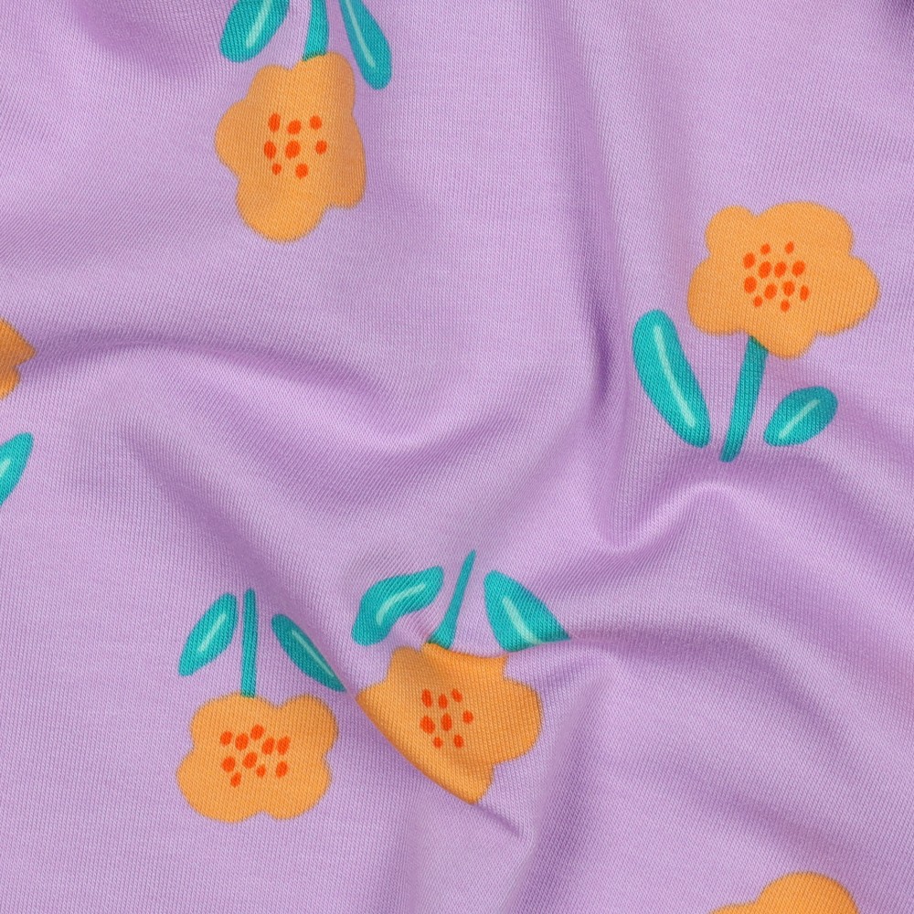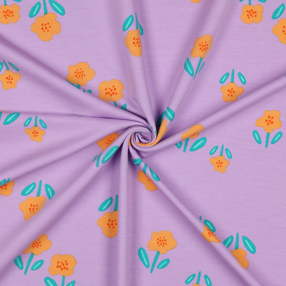 Deze frenchterry met lavendelkleurige achtergrond en lieve bloemetjes is een zachte en comfortabele stof met een romantische en dromerige uitstraling. De rustige lavendeltint in combinatie met het fijne bloemenpatroon zorgt voor een lieve, frisse en vrouwelijke look die perfect past bij zowel kinder- als volwassenencollecties.