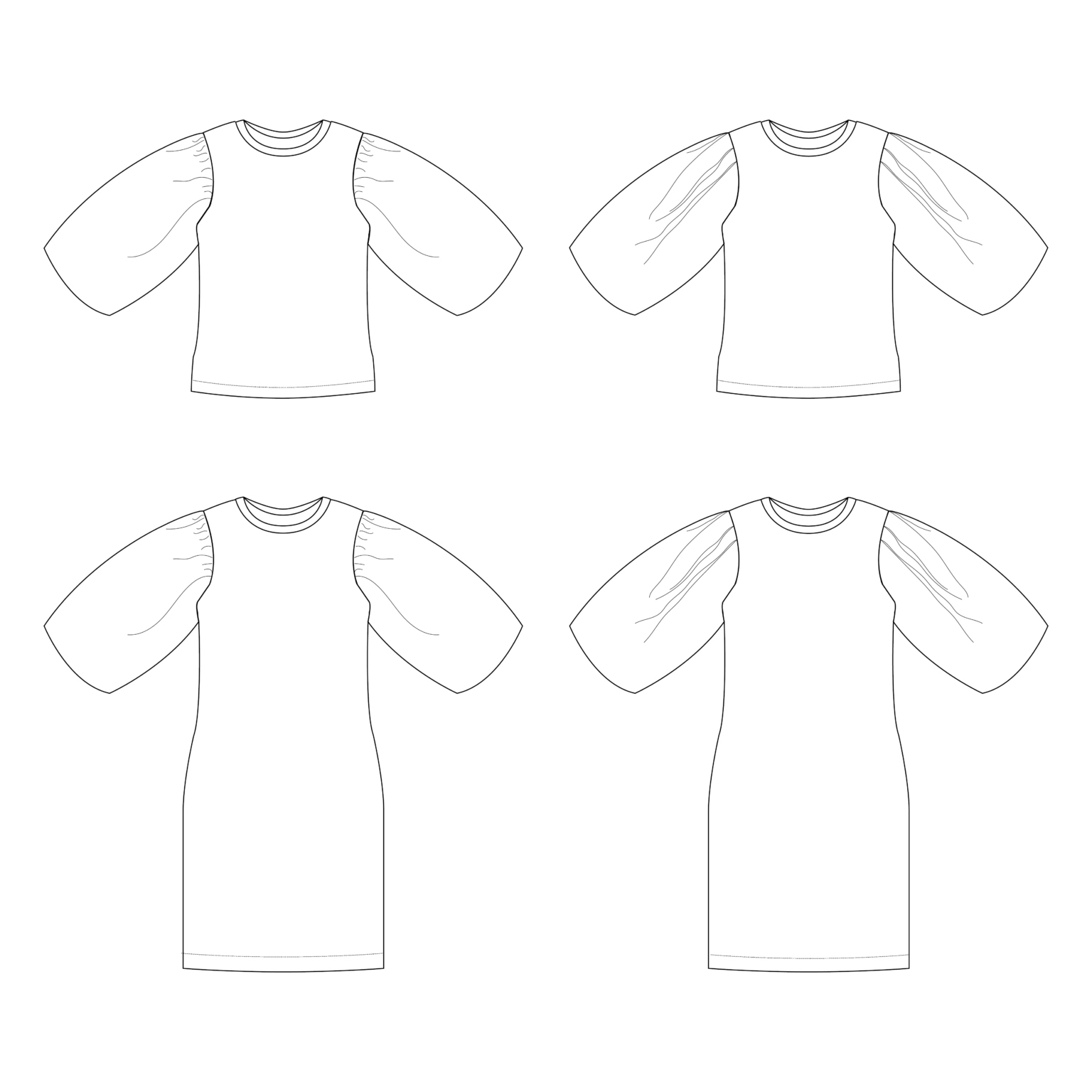 Voor de mouwen zijn verschillende opties voorzien: een ballonmouw met plooien aan de schouder en een ballonmouw met rimpels aan de schouder.