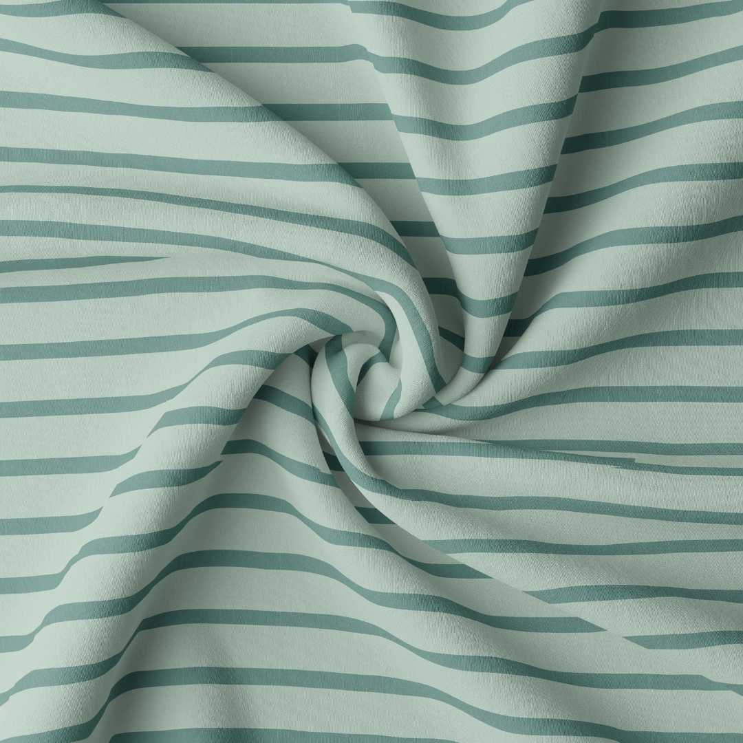 Deze jersey met Bretonse strepen in mintgroen en eucalyptus ademt frisheid en rust. De zachte, koele tinten geven het klassieke streepmotief een moderne, natuurlijke uitstraling, terwijl de soepele, rekbare kwaliteit zorgt voor optimaal draagcomfort.
