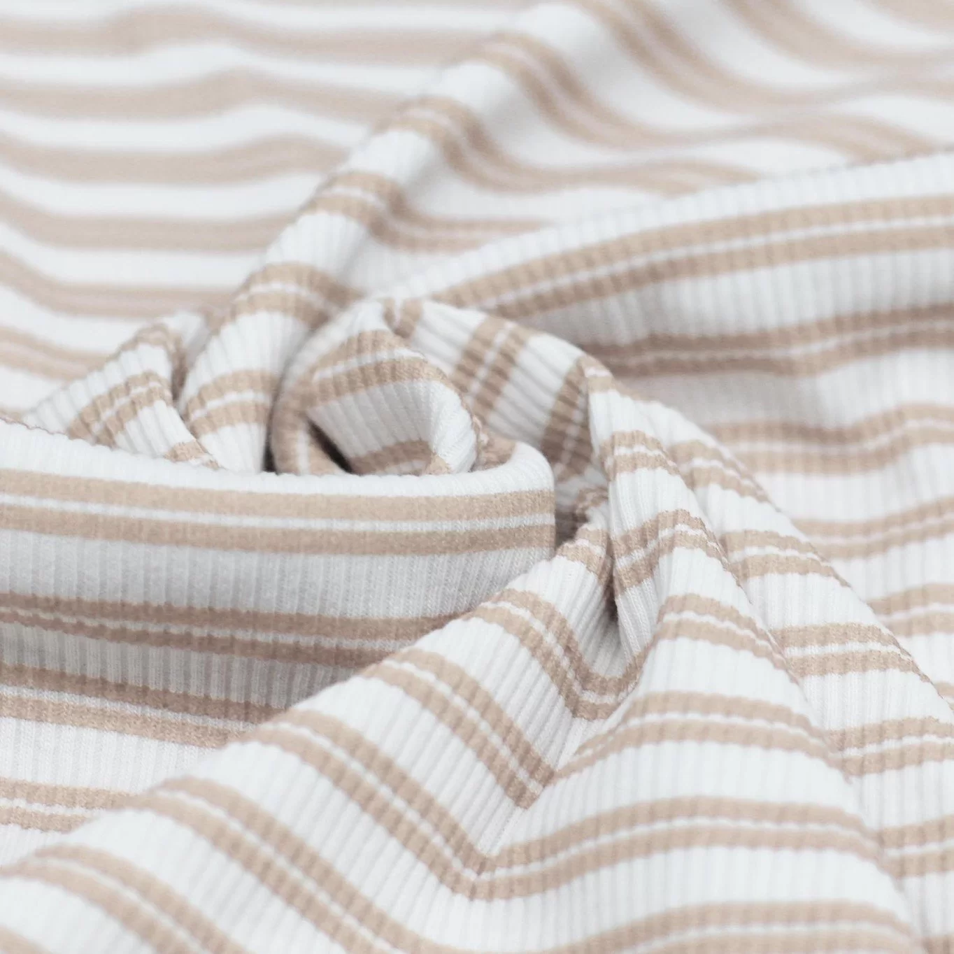 Onze gestreepte ribjersey in beige met offwhite combineert comfortabele rekbaarheid met een klassieke, stijlvolle look. Het zachte materiaal voelt heerlijk aan op de huid en biedt een perfecte pasvorm voor diverse kledingstukken.