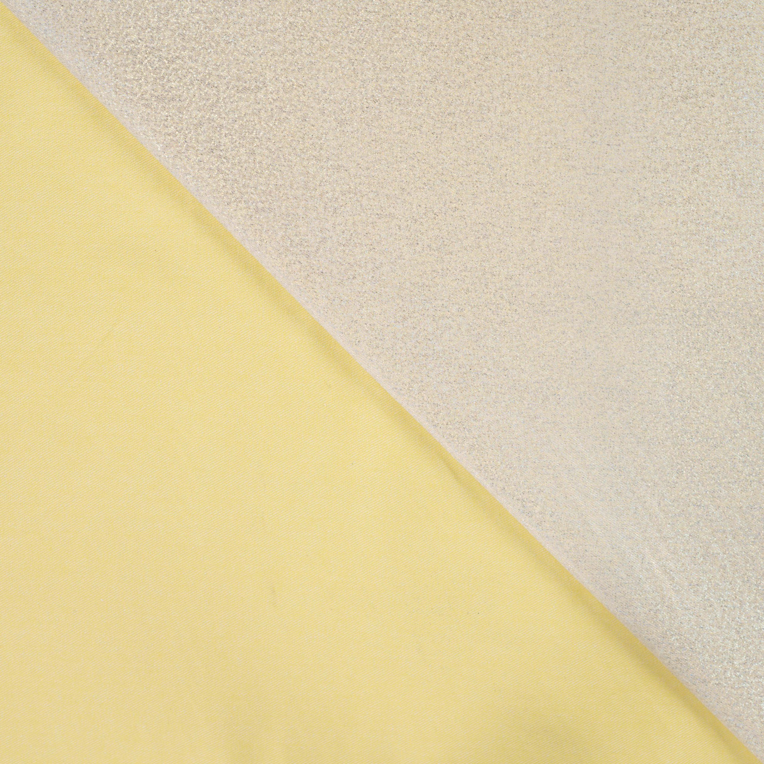 Deze zachtgele denim met glans- en glitterlaag combineert een frisse pastel kleur met een subtiele sparkle. De zachte gele tint geeft de stof een lichte, zomerse uitstraling, terwijl de glanzende afwerking zorgt voor een speelse en opvallende touch.