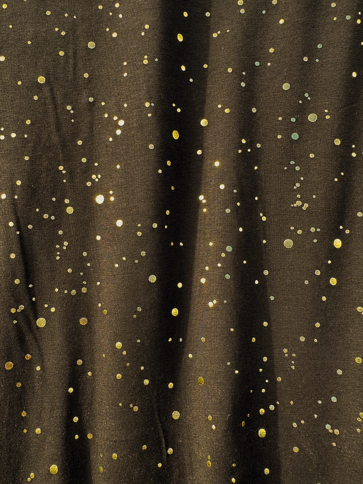 Ga voor een stijlvolle en luxueuze look met onze Golden dots jersey. Deze zachte, rekbare tricotstof combineert een diepe zwarte kleur met verfijnde gouden stippen, wat zorgt voor een elegante en feestelijke uitstraling. Perfect voor jurkjes, tops, rokjes of stijlvolle kinderkleding. De soepele kwaliteit voelt heerlijk zacht aan en beweegt comfortabel mee bij elke gelegenheid.