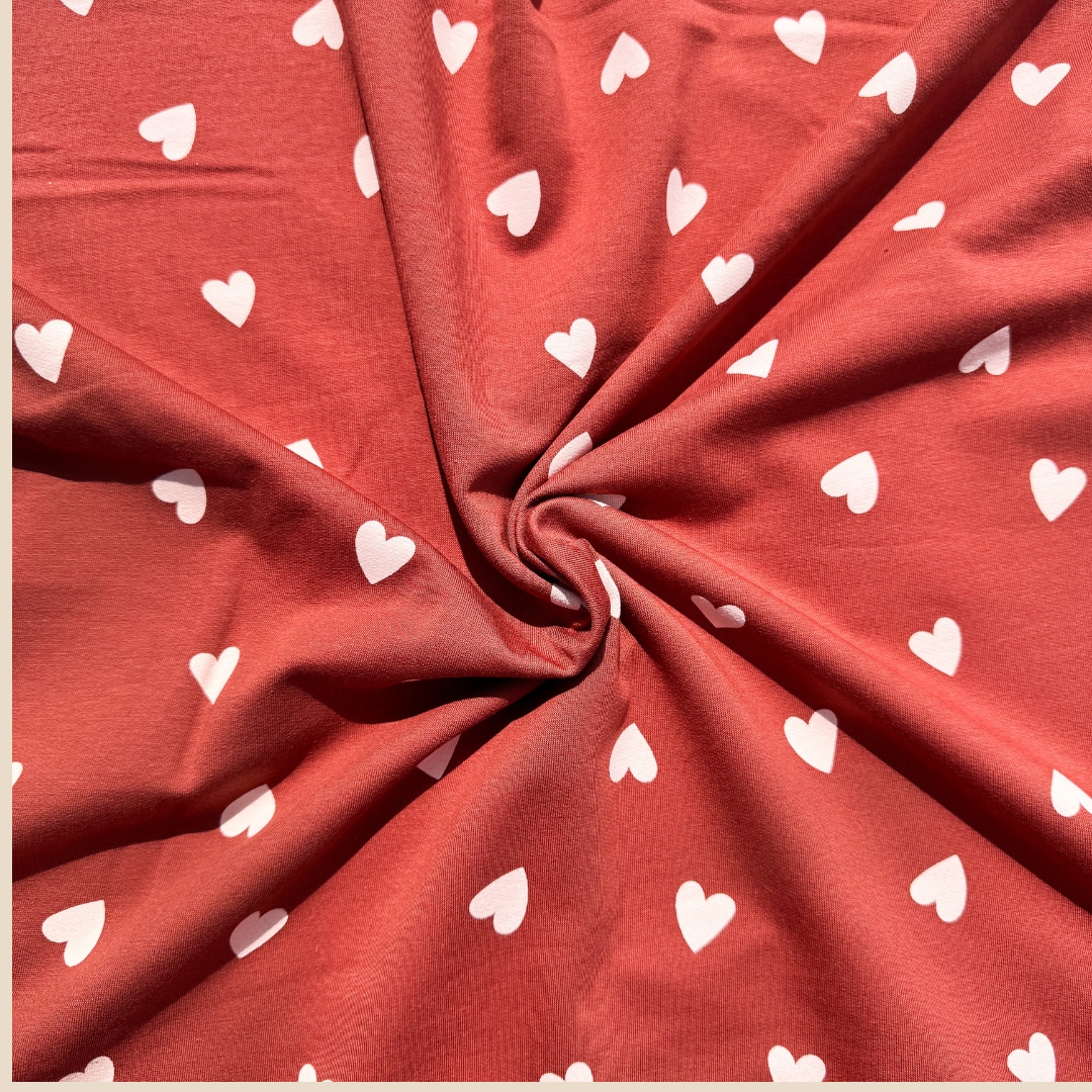 Liefde op het eerste gezicht! Deze French Terry stof met speelse hartjes op een diep rode achtergrond straalt warmte, vrolijkheid en zachtheid uit. De heldere witte hartjes steken prachtig af tegen het rijke rood en maken deze stof perfect voor romantische of lieve creaties.
