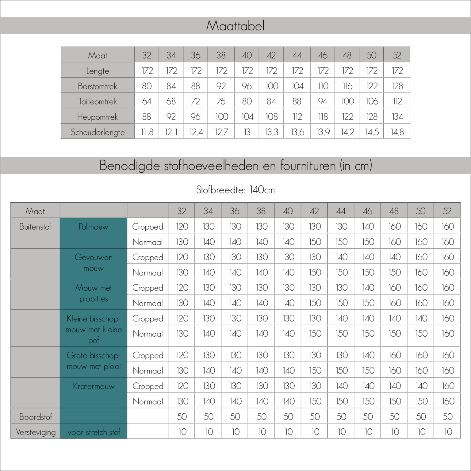 -het patroon afgedrukt op 2 A0 pagina’s in de maten 32, 34, 36, 38, 40, 42, 44, 46, 48, 50 en 52