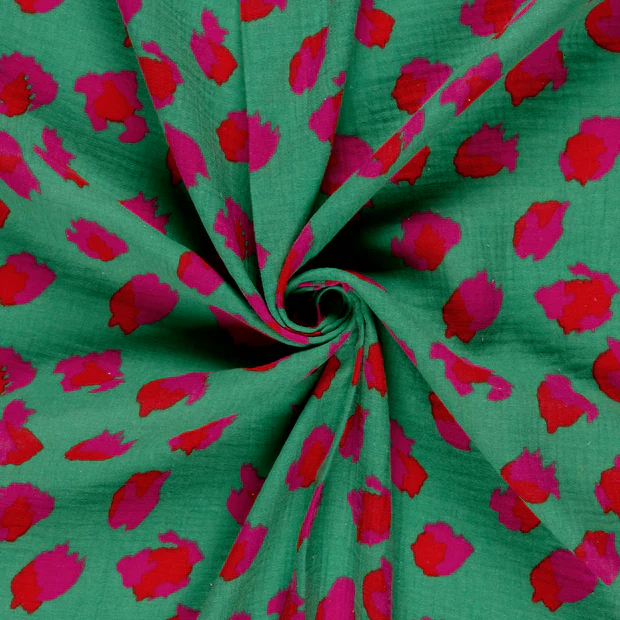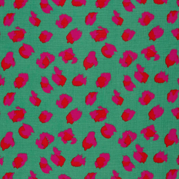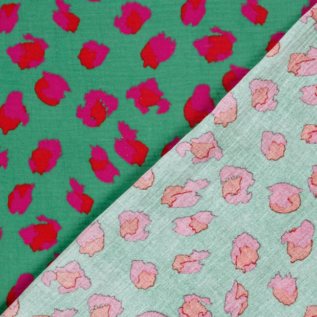 Breng kleur en energie in je creaties met onze hydrofiel Pop Leo Mint. Deze speelse stof combineert een frisse groene ondergrond met opvallende leo vlekken in felle roze- en roodtinten. Het resultaat is een vrolijke, trendy print met een echte eye-catching uitstraling.