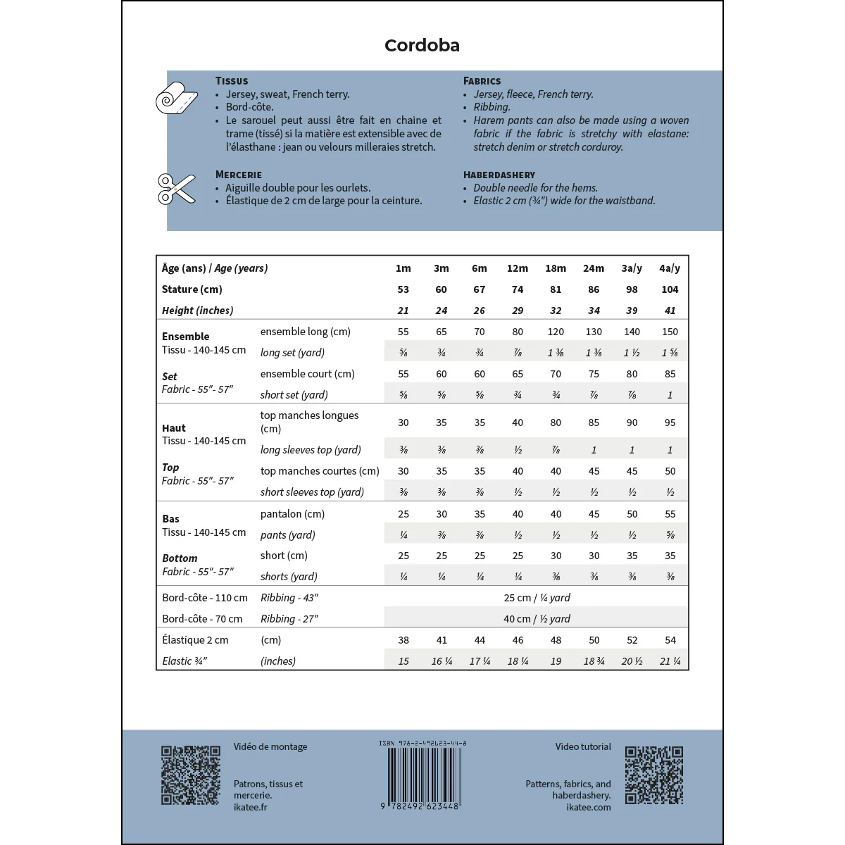 Cordoba is een patroon voor gebreide pyjama’s voor baby’s, zowel voor jongens als meisjes. Het bestaat uit een topje met mouwen die doorlopen in het lijfje (korte of lange mouwen) en een broekje (lange broek of bermuda) in haremstijl zonder middennaad. De pasvorm is los en comfortabel, en de tailleband is elastisch. De boorden, enkelbandjes, tailleband en kraag zijn geribbeld.