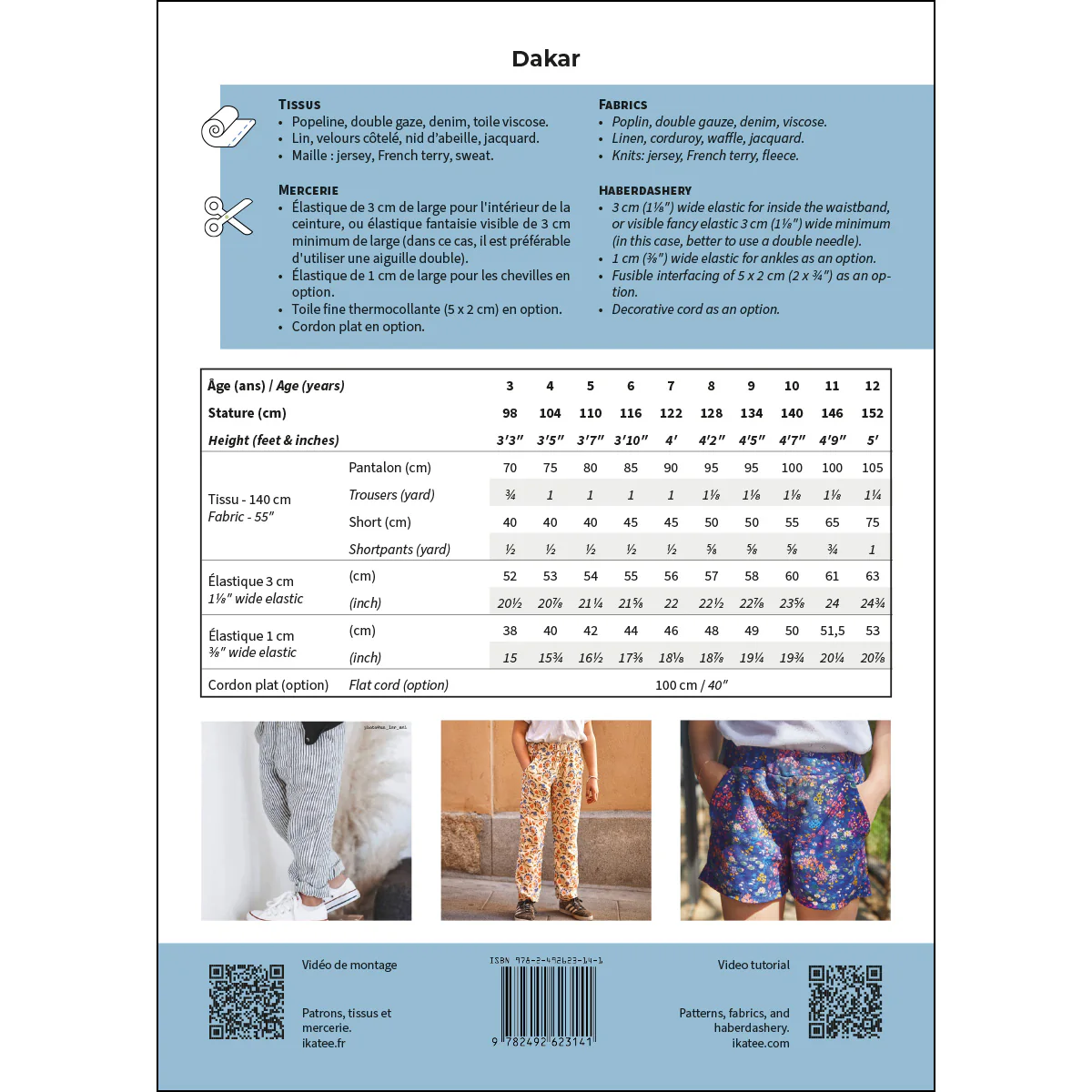 Dakar is een patroon voor een unisex broek of short met twee voorzakken en een licht losse pasvorm. Dankzij de elastische tailleband is het kledingstuk heel gemakkelijk aan te trekken. Optioneel kun je een decoratief trekkoord aan de tailleband toevoegen en/of elastische zomen aan de broekspijpen maken.