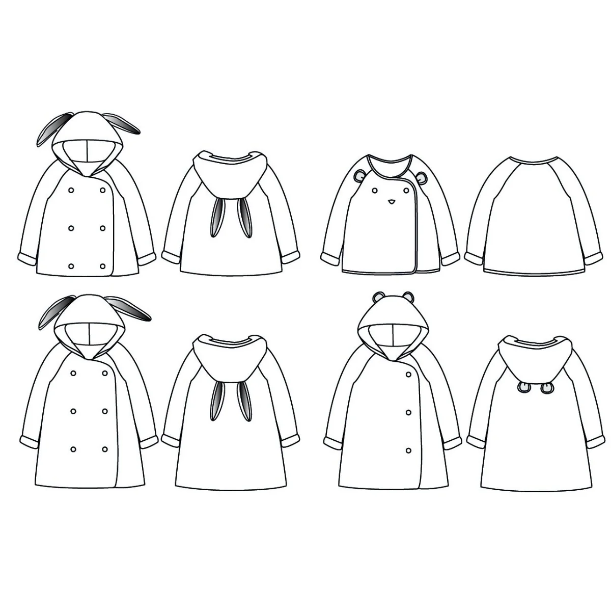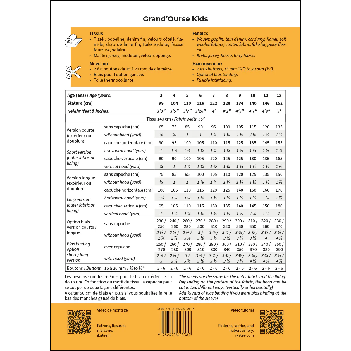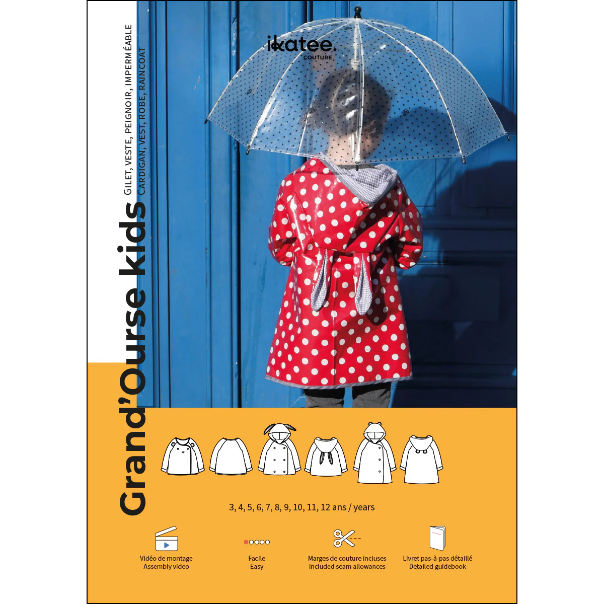 Grand’ourse Kids is een patroon voor een kindervest, -jas, -regenjas of unisex badjas. Het is verkrijgbaar in twee lengtes, met of zonder capuchon. Konijnen- en berenoortjes kunnen worden toegevoegd. Het kledingstuk kan worden gevoerd of afgewerkt met een biaisband.