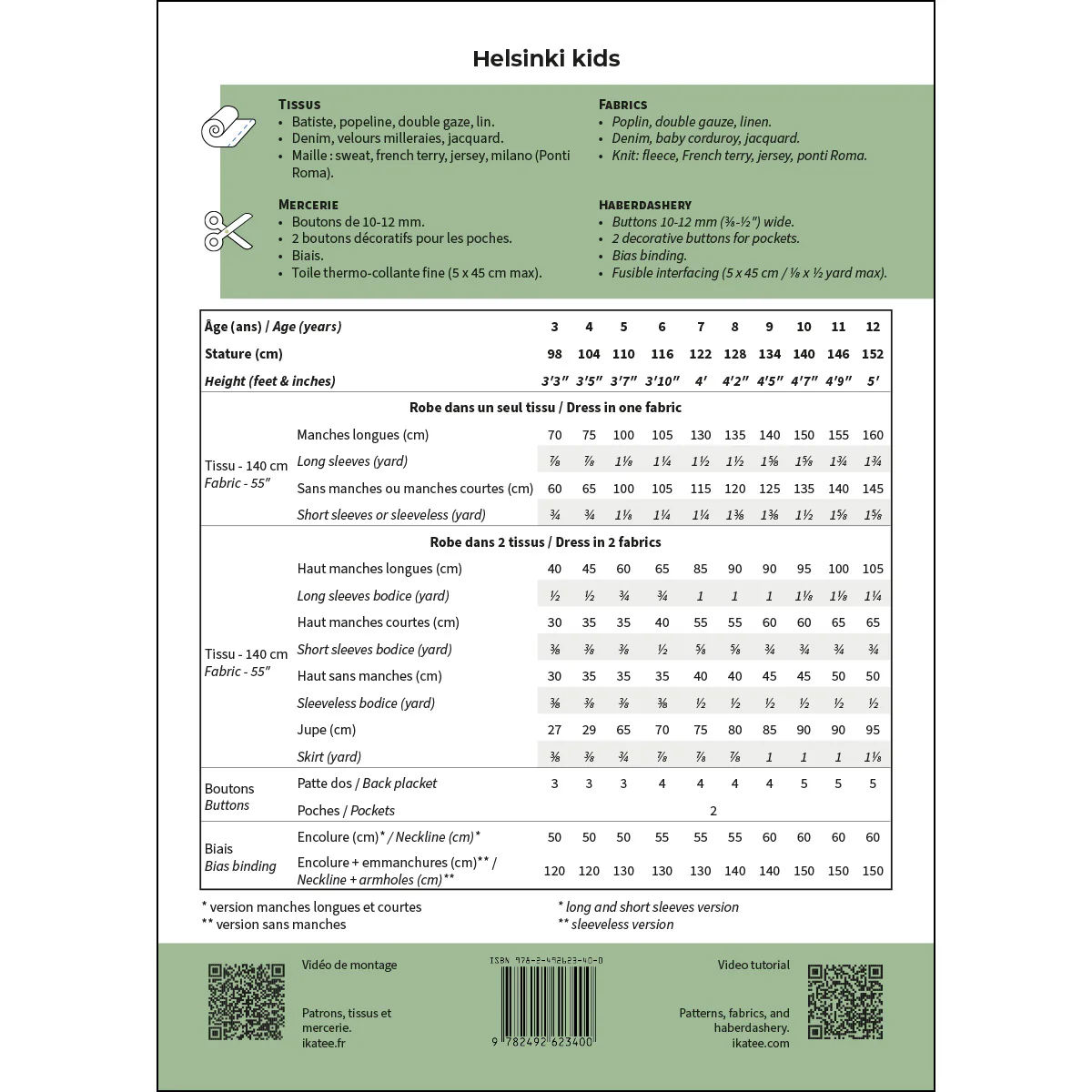 Helsinki Kids is een jurkpatroon voor meisjes. Het is verkrijgbaar met lange, korte of mouwloze mouwen. De halslijn en armsgaten zijn afgewerkt met biaisband, maar in een bonusvideo wordt getoond hoe je de buste volledig kunt voeren. De open rug maakt het gemakkelijk om de jurk aan te trekken, net als de ruime pasvorm. De jurk kan worden gemaakt van gebreide of geweven stof, of een combinatie van beide!