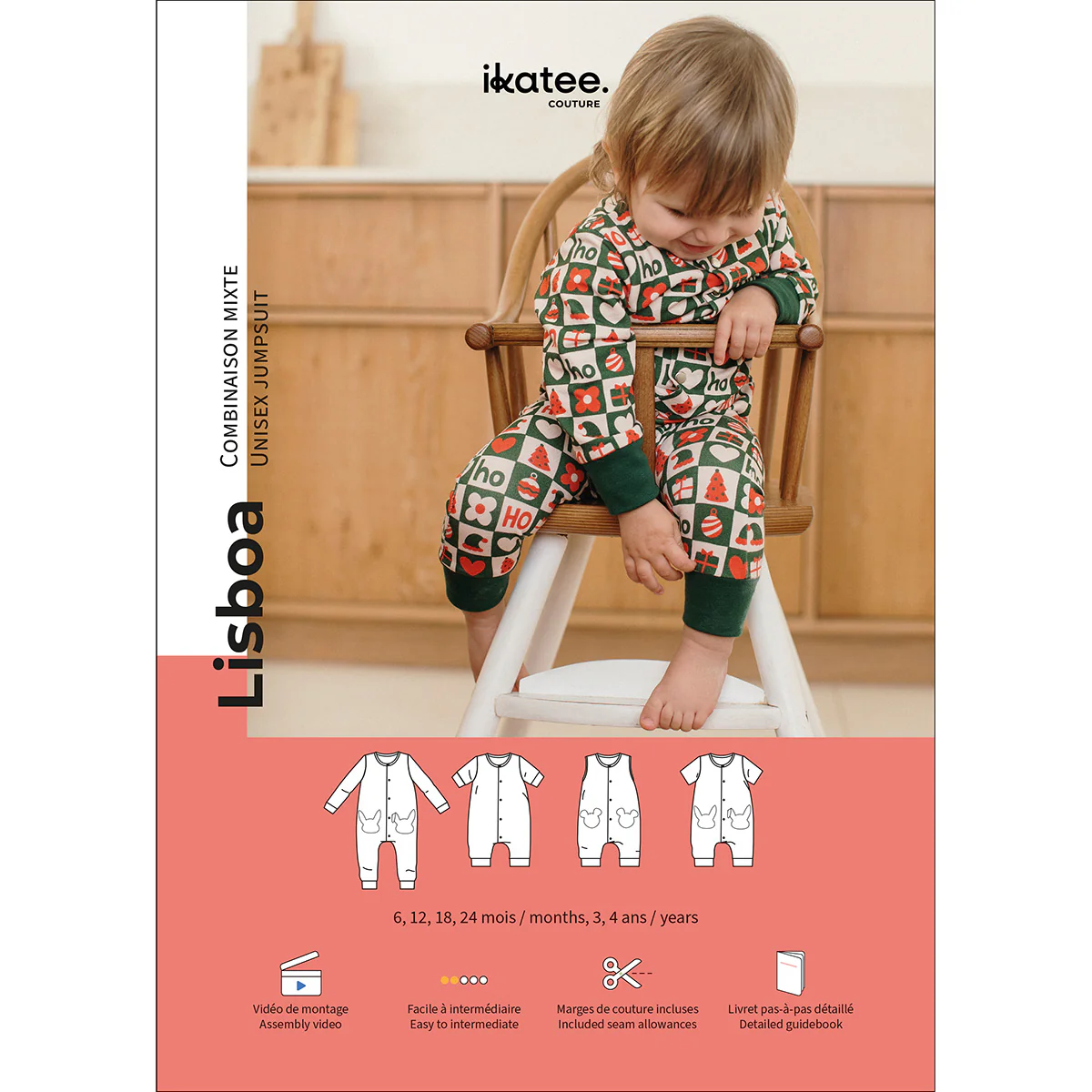 Lisboa is een patroon voor een unisex babyjumpsuit of pyjama. Het ontwerp kan worden gemaakt met lange, korte of mouwloze mouwen, en met lange of korte pijpen. Een knoopsluiting aan de voorkant maakt het mogelijk om het kledingstuk aan te trekken. Optioneel zijn er leuke zakjes (konijn- of muisvormig).