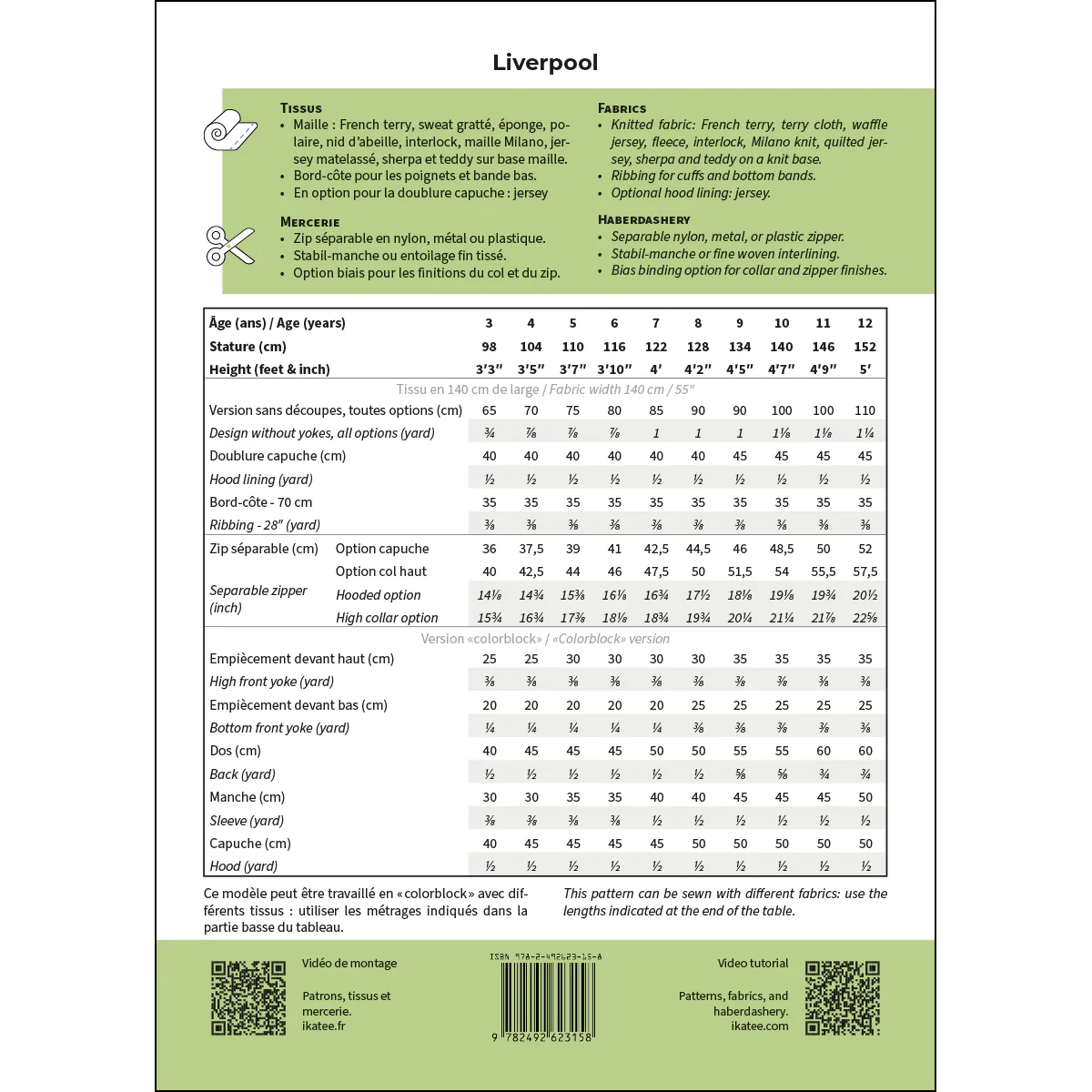 Liverpool is een patroon voor een kindertrui met rits, capuchon of opstaande kraag en zorgvuldig afgewerkte details. De pasvorm is los, licht oversized en comfortabel, met verlaagde schouders. Je kunt kangoeroezakken en naden aan de voorkant toevoegen. De mouwen en de onderzoom zijn afgewerkt met ribboord.