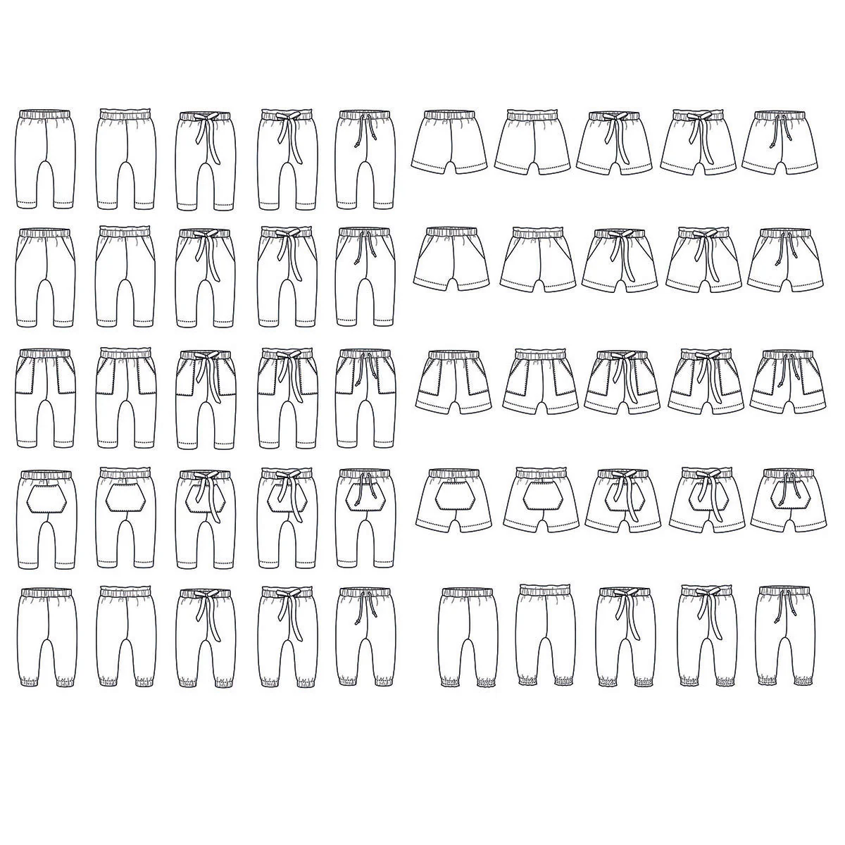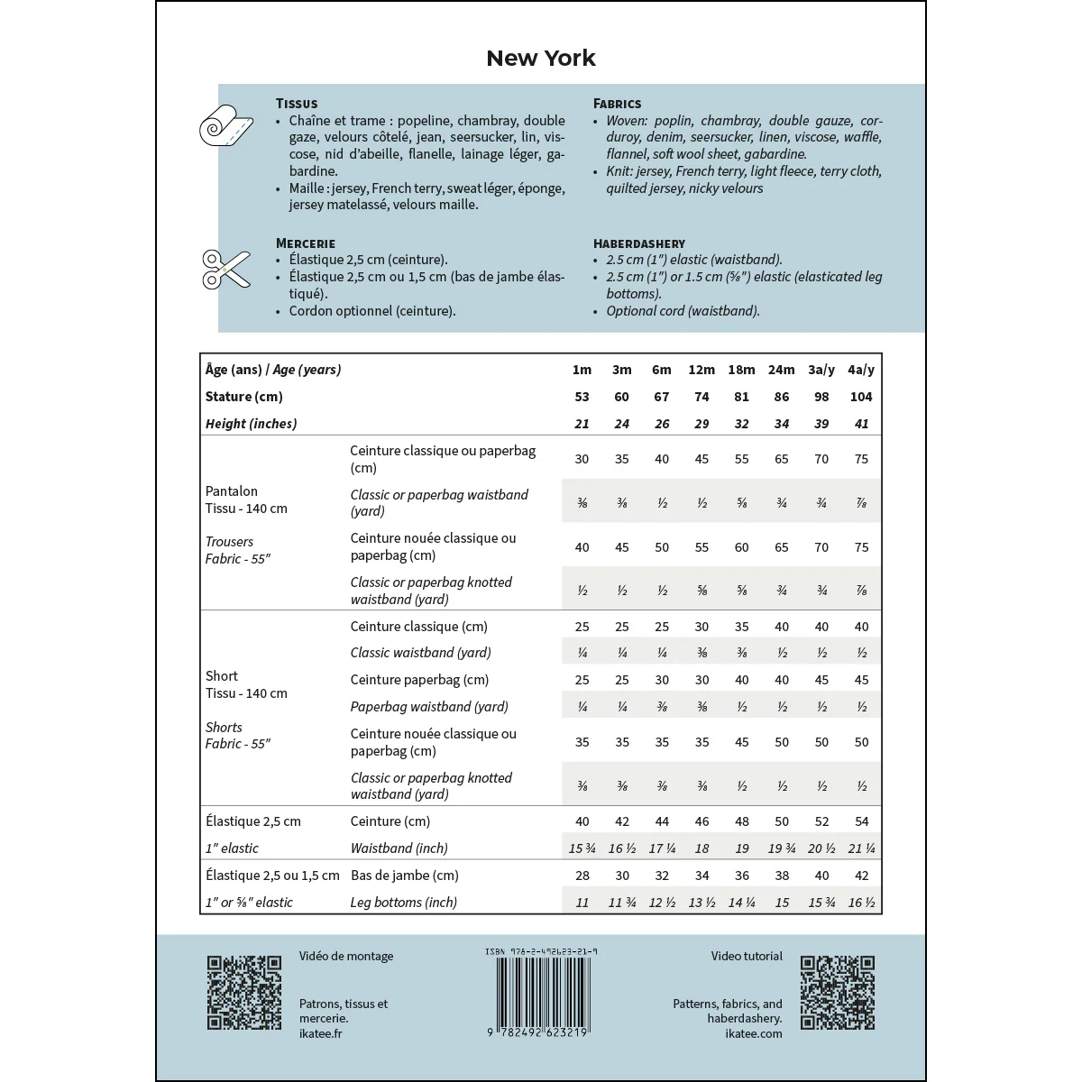 New York is een unisex patroon voor babybroekjes en -shorts. De pasvorm is comfortabel en de elastische tailleband maakt het aantrekken snel en gemakkelijk. Het patroon biedt verschillende varianten: twee lengtes, vier taillebandopties (klassiek, paperbag, met een klassieke strikband of met een paperbag strikband), vier zakopties (zonder zakken, Italiaanse zakken, opgestikte zakken of kangoeroezak) en drie zoomopties (klassiek, elastisch of elastisch met een ruche).