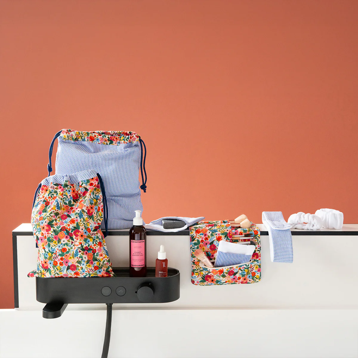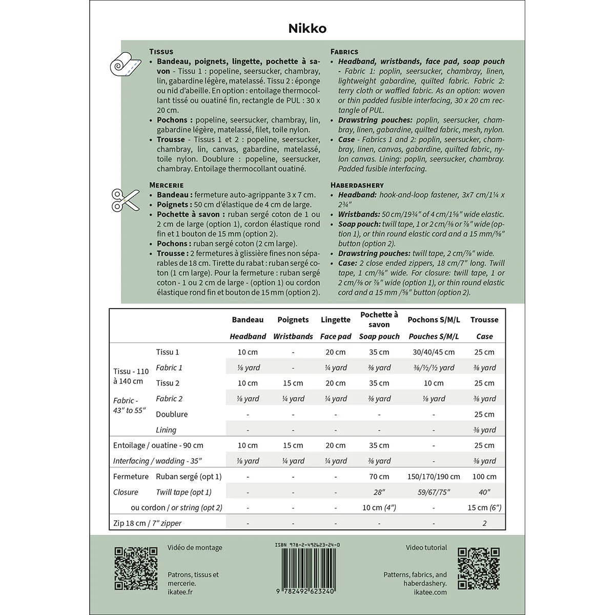 Nikko is een set patronen waarmee je 6 badkamer- en reisaccessoires kunt maken: een haarband en polsbandjes, een doekje, een zeepetui, opbergtasjes in drie maten en een reisetui.