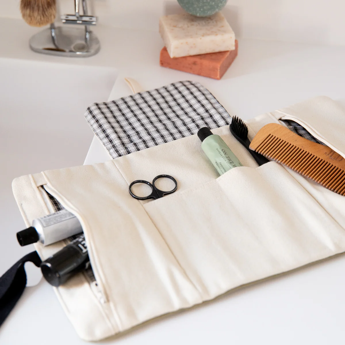 Compact, draagbaar tasje voor meerdere doeleinden: toilettas, make-uptas, opbergtas voor breinaalden of pennenetui. Het heeft vakjes en compartimenten met ritssluiting, kan in drieën worden gevouwen, sluit met strikjes of een knoop en kan worden opgehangen.