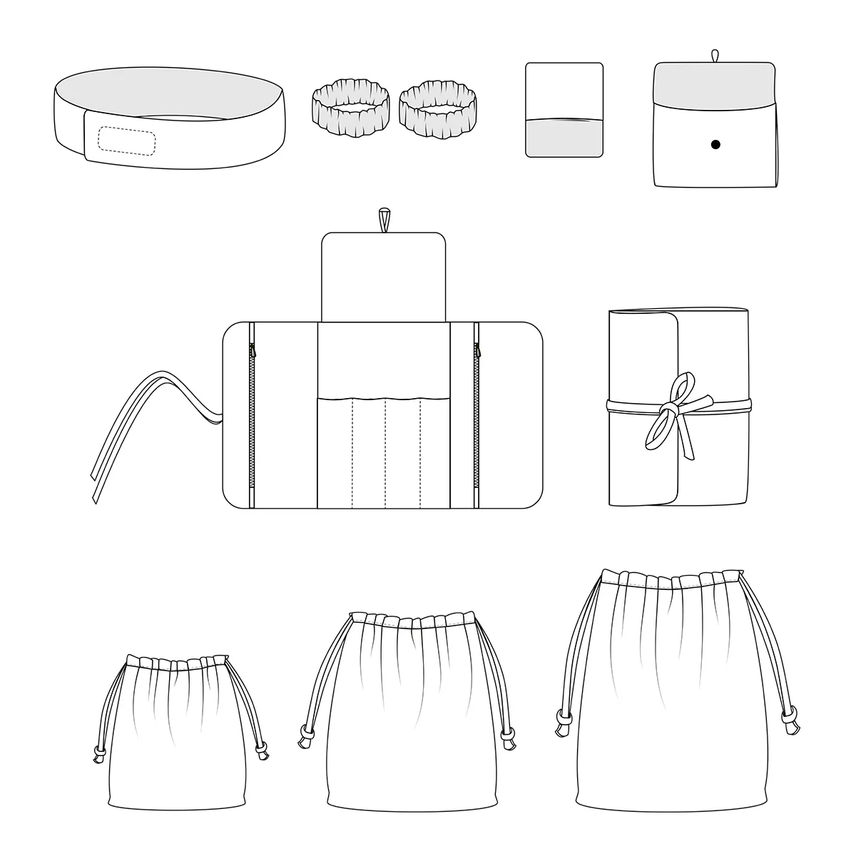 Opbergtasjes met trekkoord, trekkoorden en Franse naden.