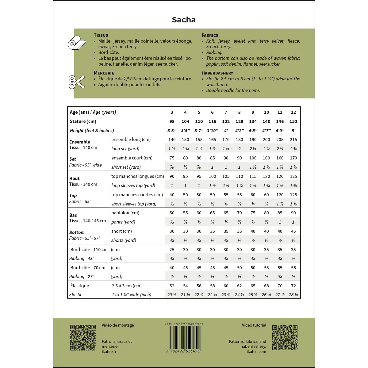 Sacha is een unisex pyjamapatroon voor kinderen. Het bovenstuk, met aangehechte mouwen, is gemaakt van gebreide stof. De broek kan van gebreide of geweven stof gemaakt worden. Dit patroon is verkrijgbaar in een korte en een lange versie. De elastische tailleband maakt het aantrekken snel en gemakkelijk. De boorden en zomen zijn geribbeld. Een