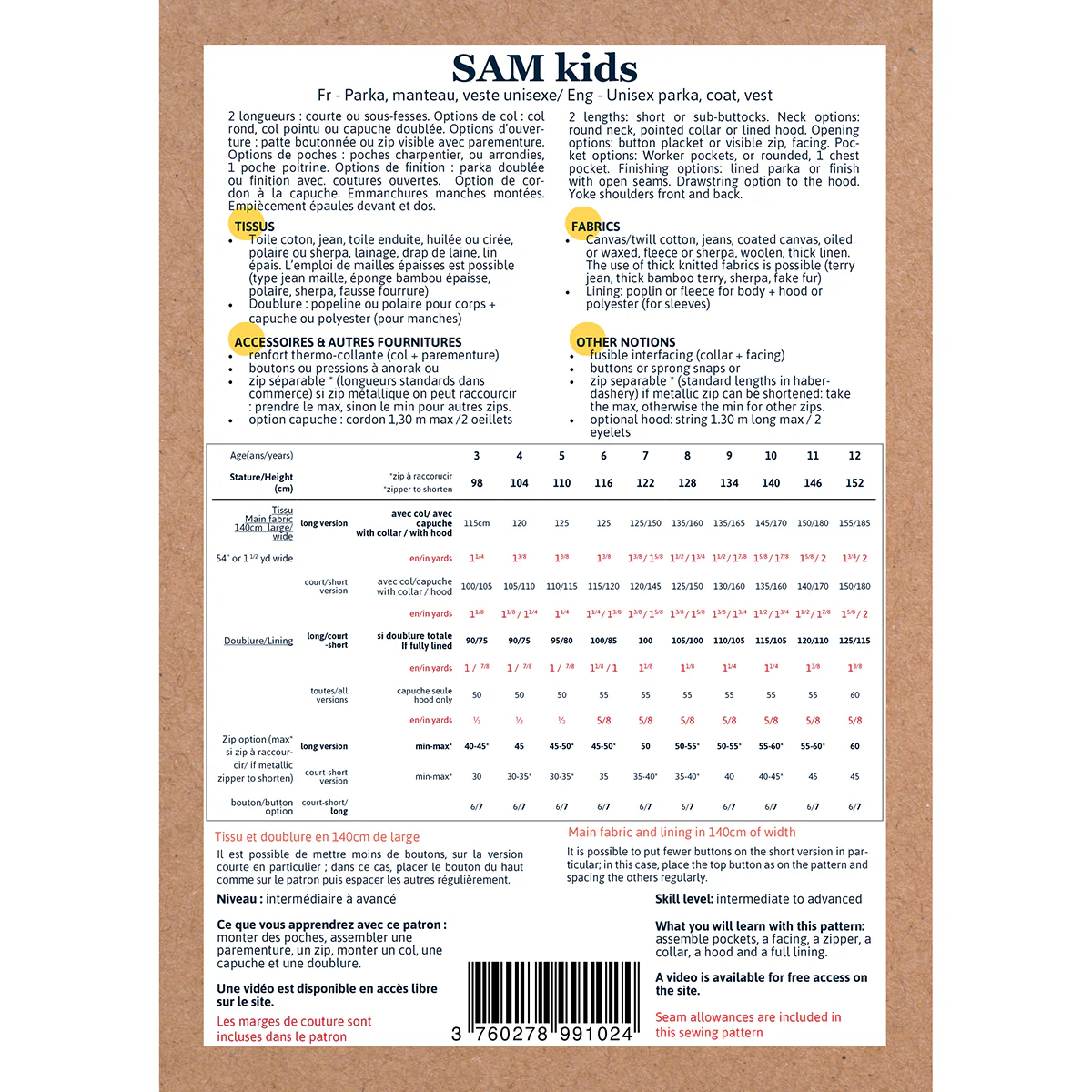 Sam Kids is een unisex parka-, jas- en mantelpatroon voor kinderen. Dit patroon, versierd met ingezette mouwen en een schouderstuk aan de voor- en achterkant, is verkrijgbaar in twee verschillende lengtes: kort of tot onder de billen. Wat dit patroon zo aantrekkelijk maakt, is de ruime keuze aan mogelijkheden om een uniek kledingstuk te creëren. Er zijn namelijk verschillende opties voor de kraag (rond, puntig of gevoerde capuchon), sluitingen (knoopsluiting of ritssluiting), zakken (opstaande, ronde of borstzakken) en afwerkingen (gevoerde parka, afwerking met open naad). Het is ook mogelijk om de capuchon te combineren met een trekkoord.