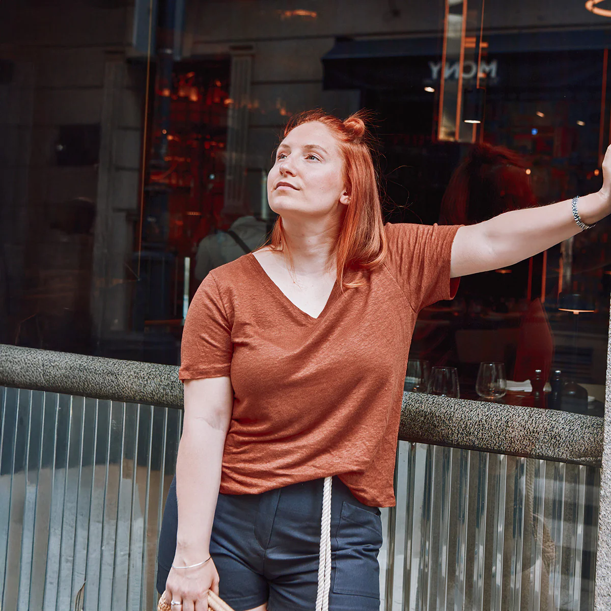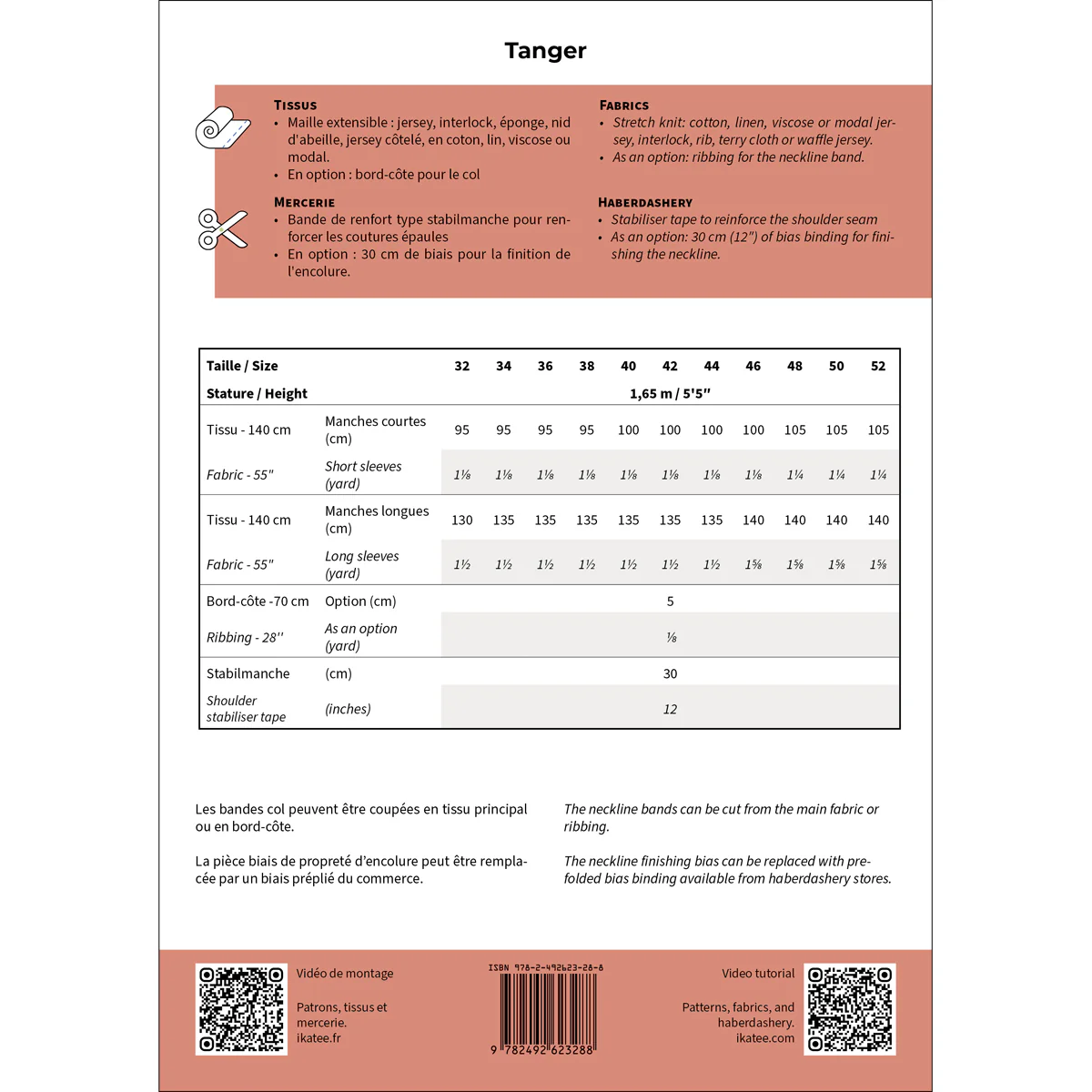 Tanger is een recht gesneden, licht losvallend T-shirtpatroon. Het biedt verschillende opties: korte mouwen, opgerolde korte mouwen of lange mouwen, een ronde hals, een licht uitgesneden halslijn of een V-hals.
