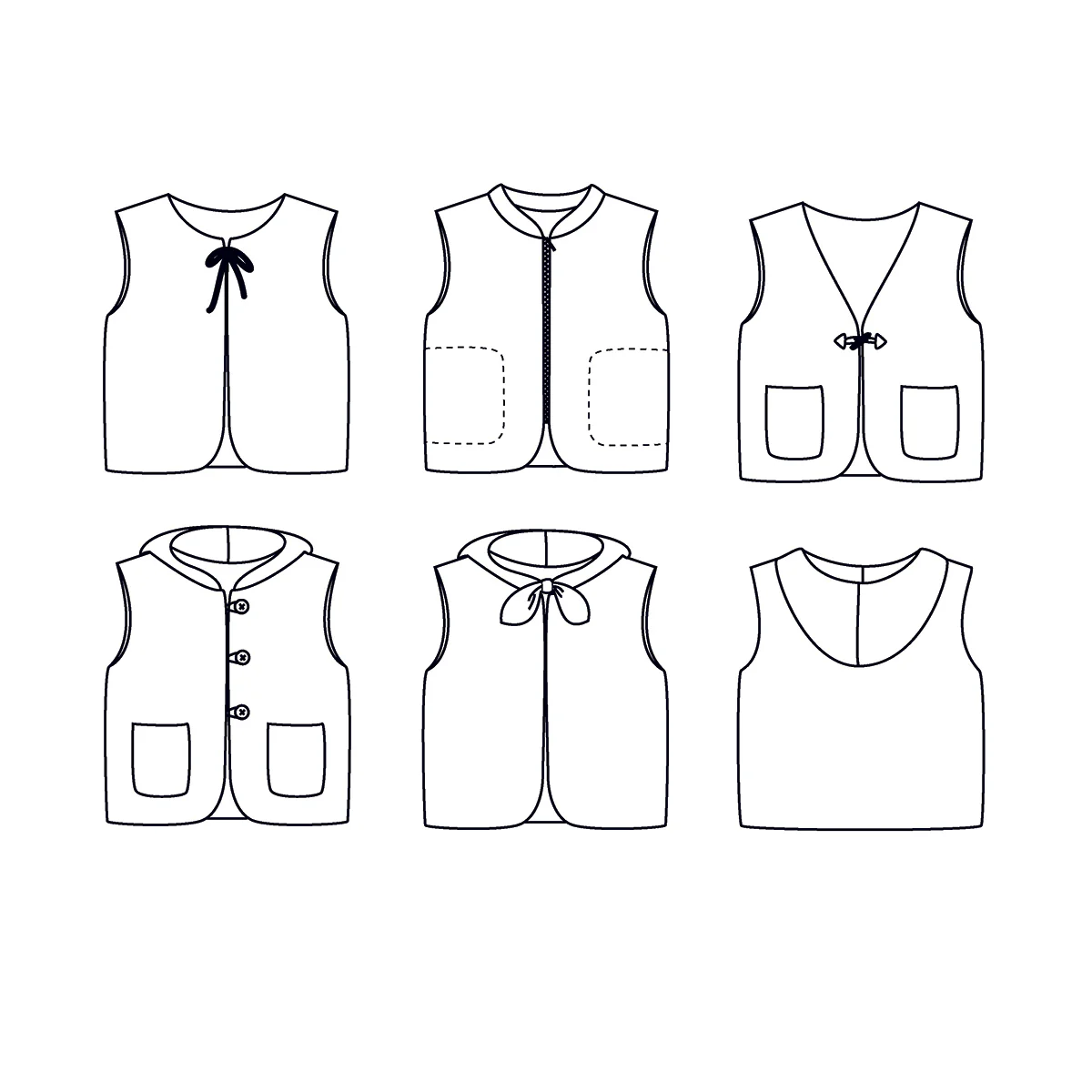 Vienne Kids is een unisex mouwloos vestpatroon voor kinderen. Het vest is volledig gevoerd en, afhankelijk van de sluiting, zelfs omkeerbaar. Dit patroon biedt een breed scala aan mogelijkheden, zodat je het naar eigen smaak kunt aanpassen. Je kunt kiezen uit vijf halslijnen (V-hals, ribkraag, ronde hals, klassieke capuchon, capuchon met strik), twee soorten zakken (opgestikt, aan de zijkant) en vier soorten sluitingen (knoop + bandje, strik, knevelsluiting, rits).