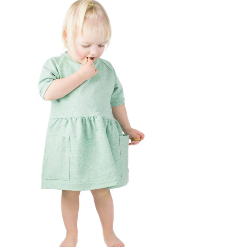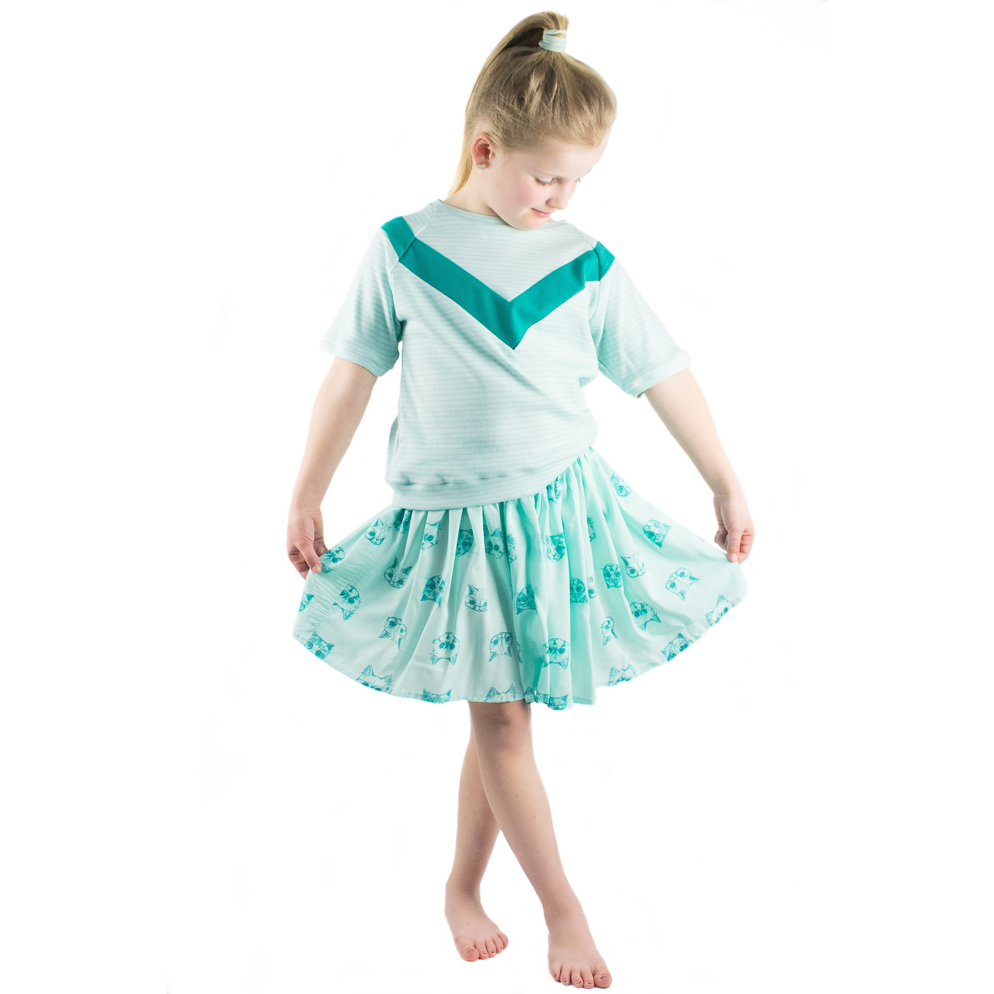 Isa is een naaipatroon voor een trendy meisjesjurk, crop top of sweater(jurk) met raglanmouwen in maten 80 – 158.
