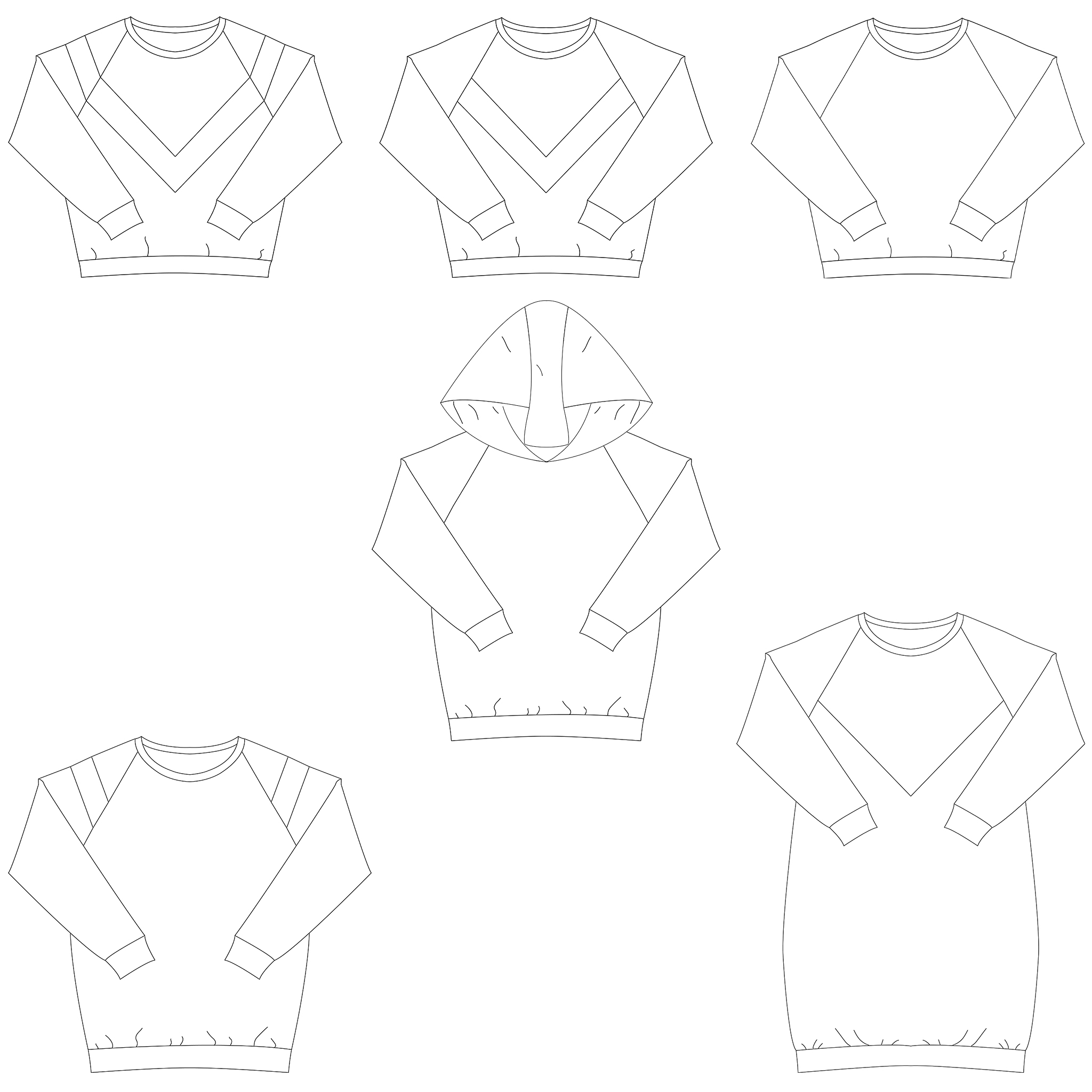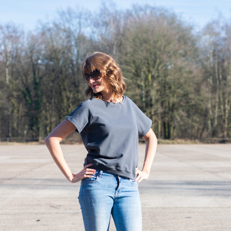 Isa is een naaipatroon voor een trendy sweaterjurk, crop top of sweater met vrouwelijke raglanmouwen in maten 32 – 48.