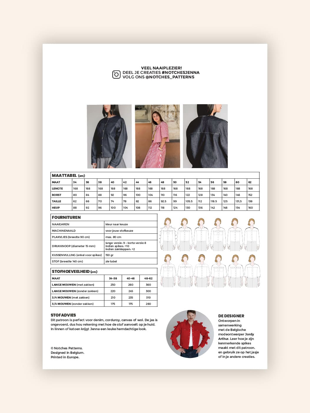 Ontwikkeld in samenwerking met modeontwerper Jordy Arthur is Jenna een verfijnd, veelzijdig jasje met prachtig uitgewerkte belijningen. Met een opvallende raglan-mouwpas en optionele spikes biedt Jenna varianten die gaan van makkelijk lente-jasje tot stijlvolle barn jacket of gedurfd avant-garde stuk. Er zijn lengte-opties, halslijnopties, mouwopties en zakopties. Kies jij voor tijdloos en minimalistisch of gedurfd en expressief?