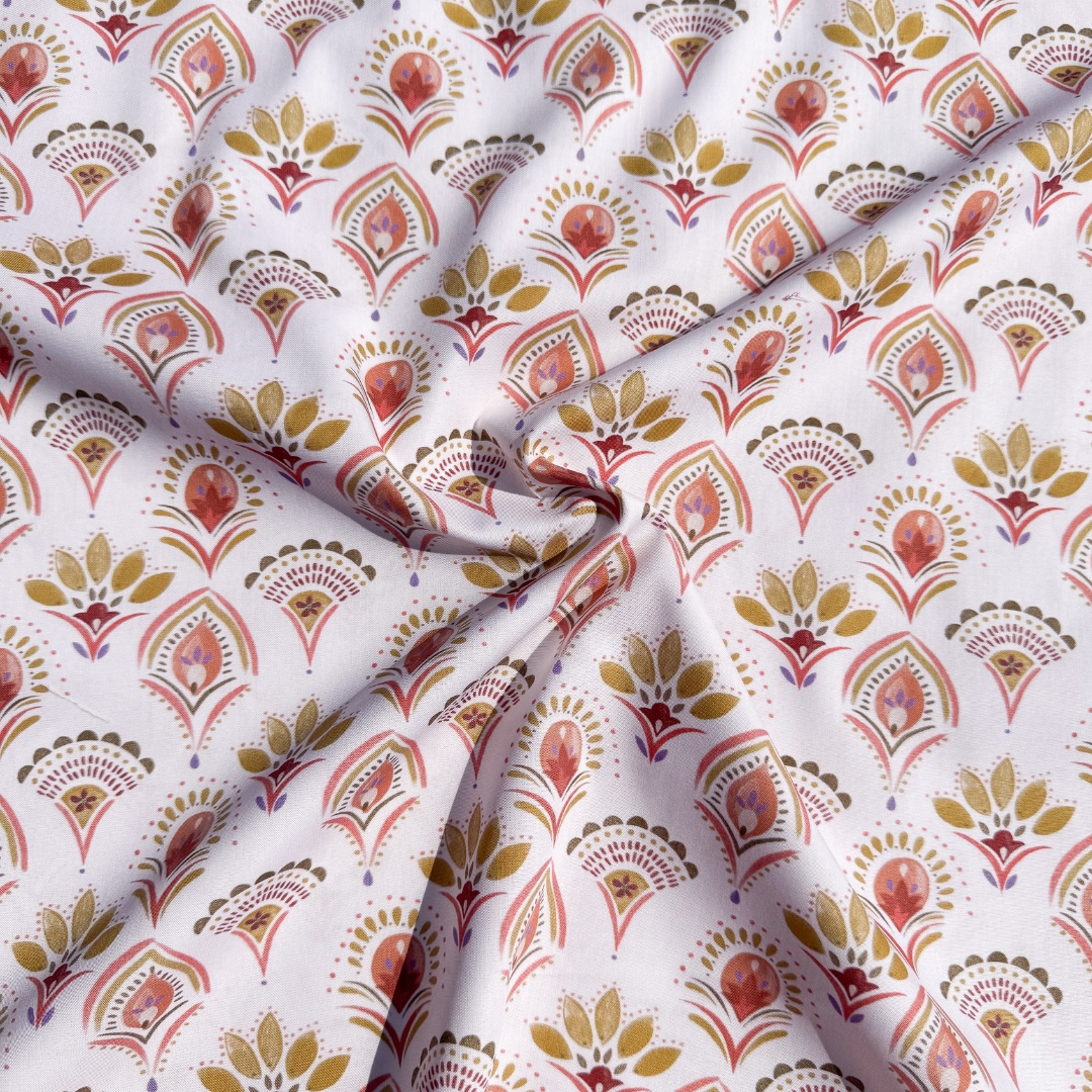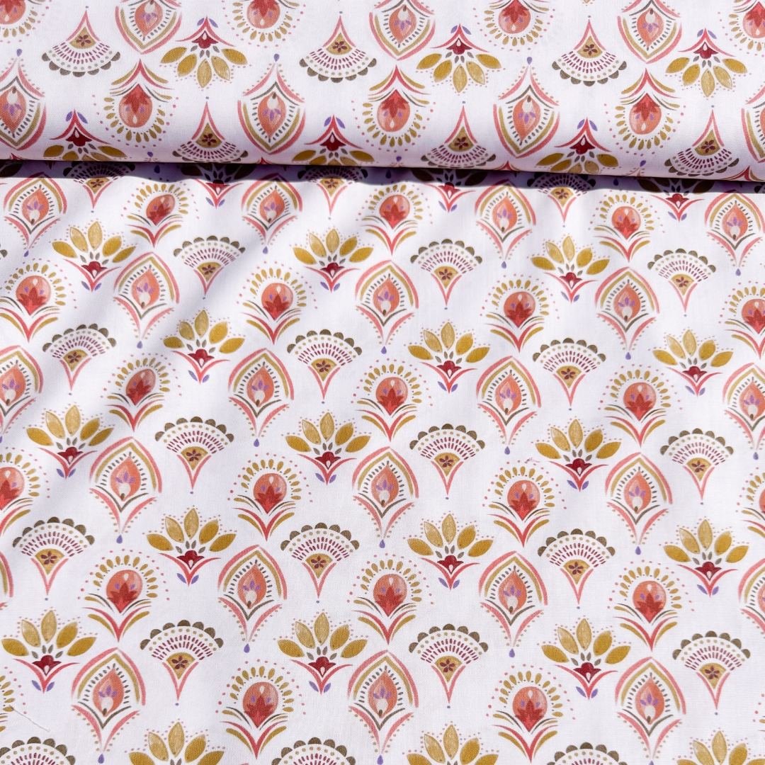 De White Bloom print straalt rust en elegantie uit. Met een lichte witte achtergrond en verfijnde bloemmotieven in zachte tinten brengt deze katoenen stof een frisse en vrouwelijke uitstraling in elk project. De bloemen lijken bijna met de hand geschilderd, wat zorgt voor een romantische, tijdloze sfeer.