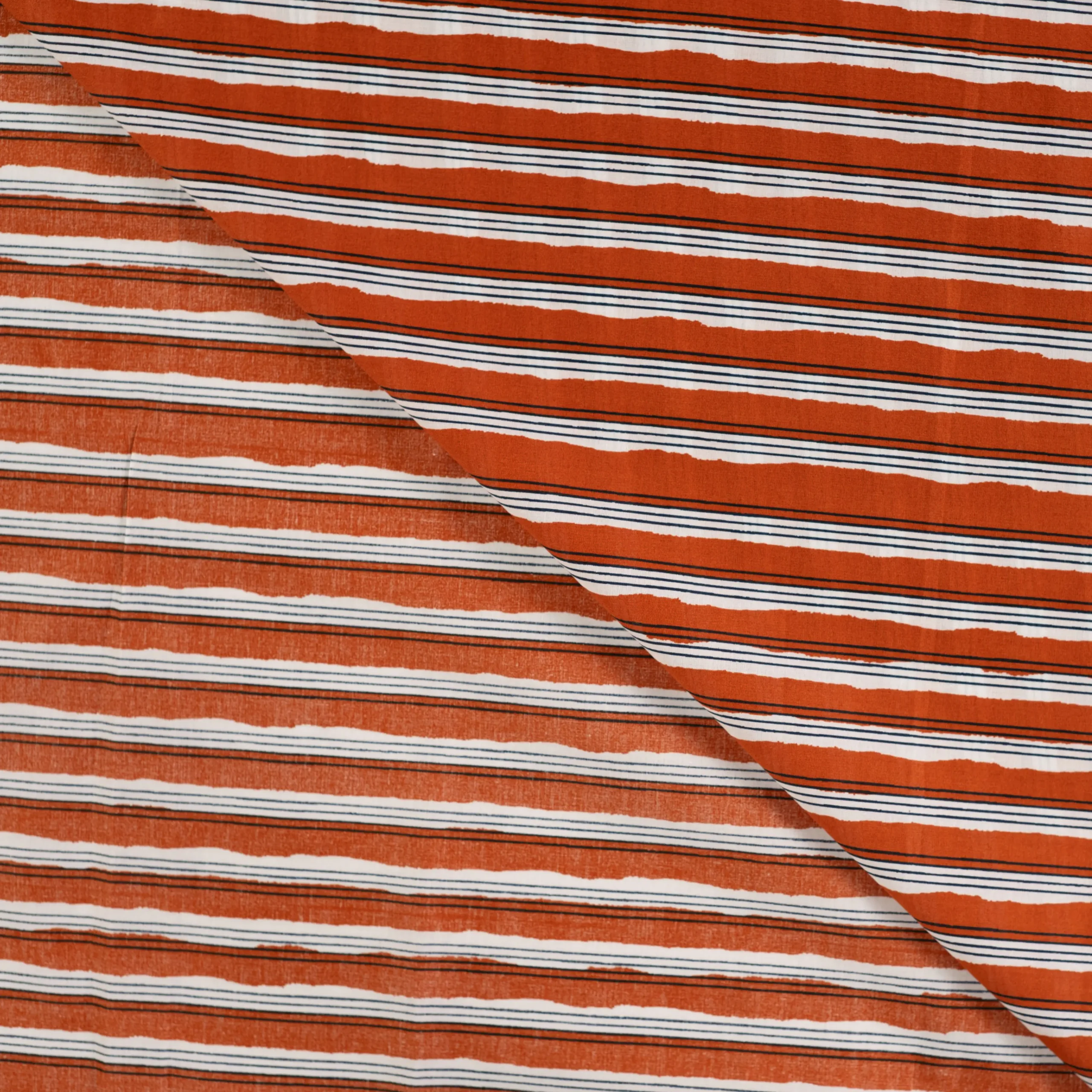 Deze katoenen stof met handgetekende strepen in roesttinten heeft een opvallende en artistieke uitstraling. De combinatie van warme roestkleurige banen met fijne zwarte en witte lijntjes zorgt voor een speels en modern effect, alsof de strepen met de hand zijn geschilderd.