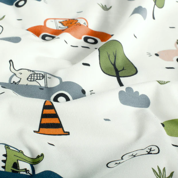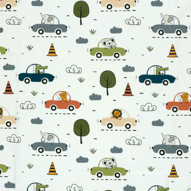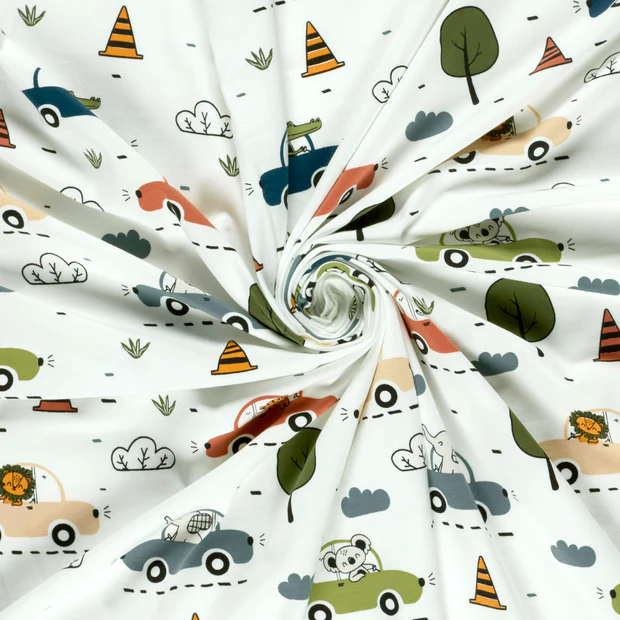 Deze katoenen jersey Little Road Trip heeft een speelse en lieve uitstraling. Het dessin met schattige dieren in autootjes, gecombineerd met boompjes, wolkjes en verkeersdetails, zorgt voor een vrolijke en avontuurlijke sfeer.