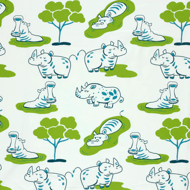 Deze katoenen jersey Safari Rhino Fun heeft een vrolijke en speelse uitstraling. Het schattige dessin met neushoorns en boompjes in frisse groen- en blauwtinten zorgt voor een avontuurlijke safari look, perfect voor kleine dierenliefhebbers.