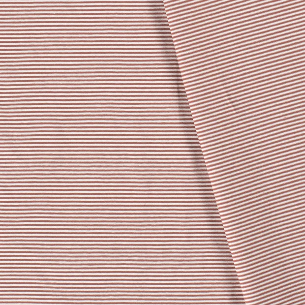 Deze yarn dyed katoenen jersey met roodhout strepen heeft een warme, natuurlijke uitstraling. Doordat de garens vooraf zijn geverfd (yarn dyed), lopen de strepen perfect door in de stof en blijven de kleuren langdurig mooi – ook na veel wassen.