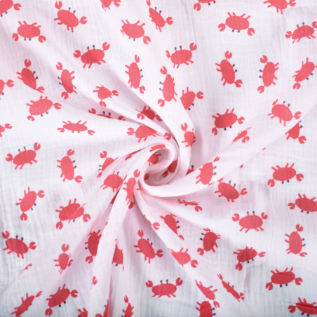 Hydrofiel met krabbetjes is een vrolijke en speelse hydrofiele stof met een leuk patroon van kleine krabbetjes. De print roept direct een zomers strandgevoel op en is perfect voor baby- en kinderproducten met een frisse, maritieme uitstraling. Deze stof brengt plezier en zachtheid samen in één comfortabel materiaal.