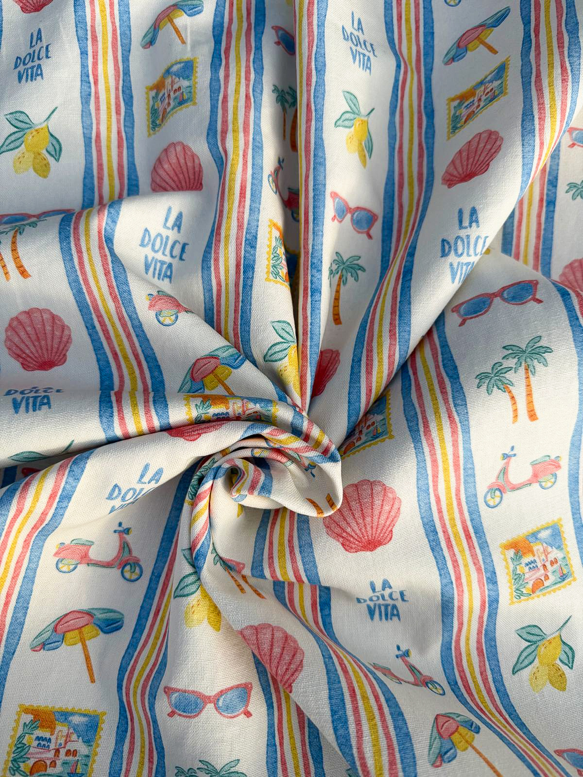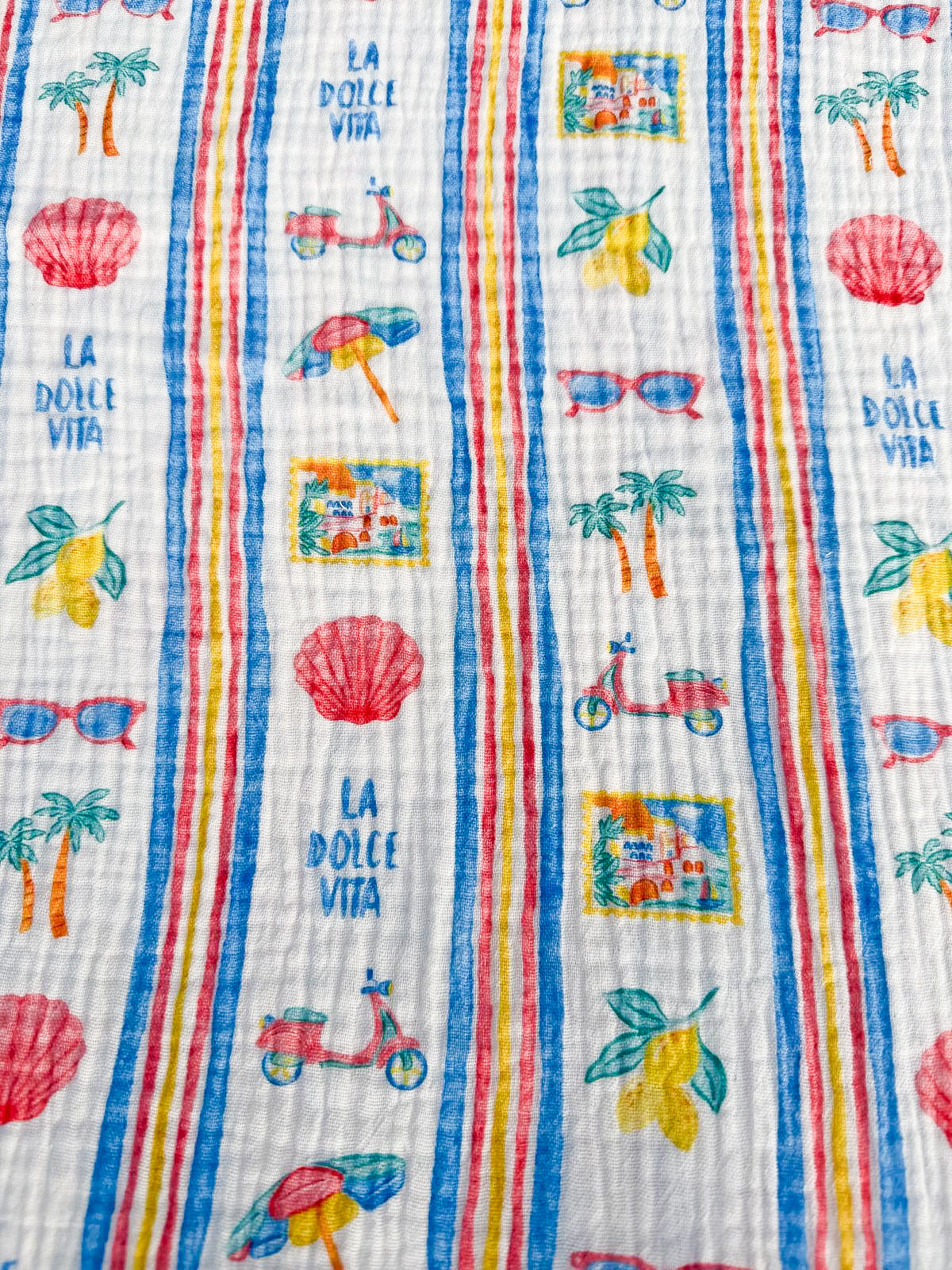 La Dolce Vita op hydrofiel is een vrolijke en stijlvolle hydrofiele stof die het ultieme zomergevoel vangt. Geïnspireerd door het goede leven, zonovergoten dagen en mediterrane sferen, straalt deze print warmte, kleur en levenslust uit. Perfect voor iedereen die houdt van een speelse, zonnige en positieve uitstraling.