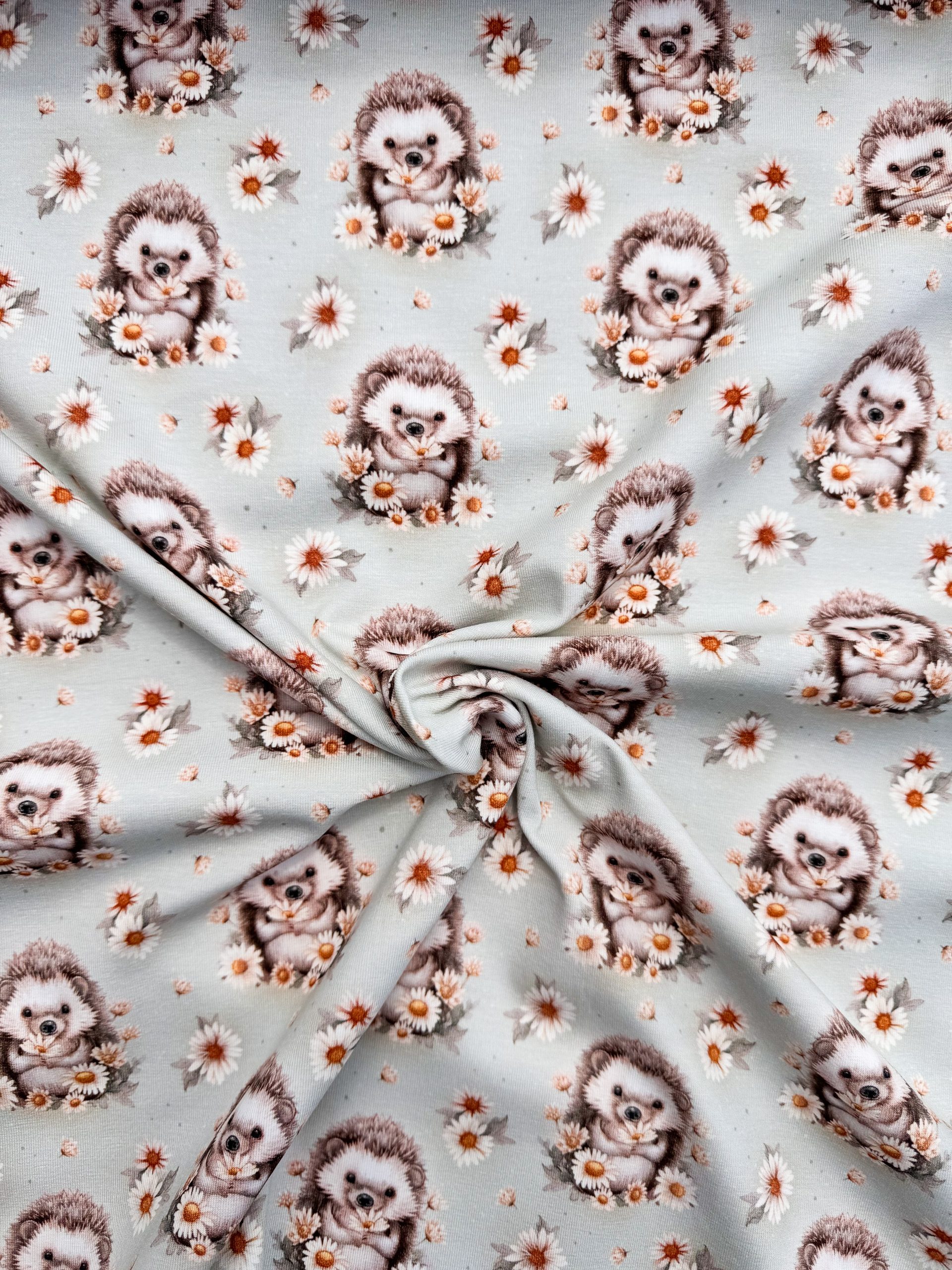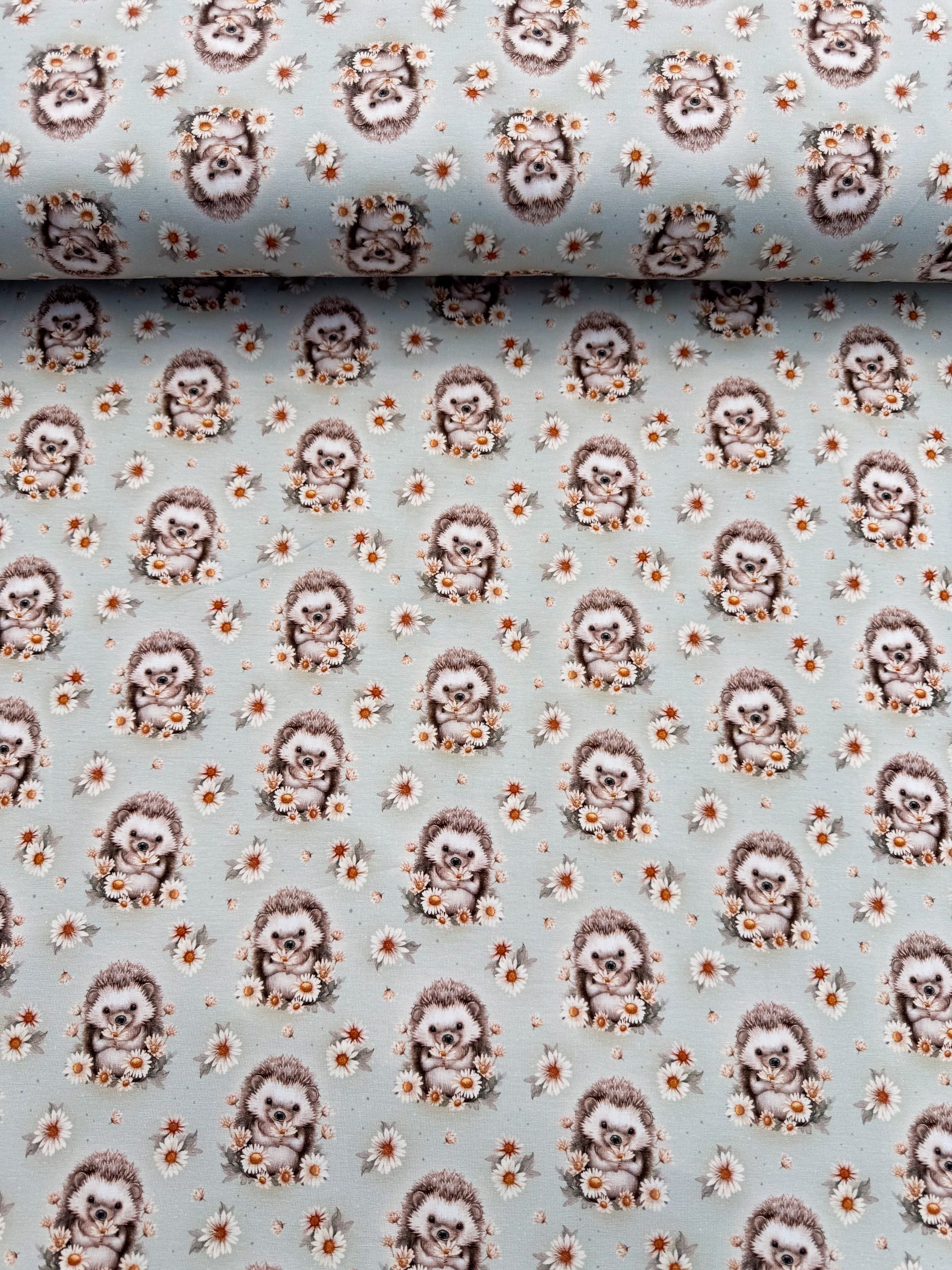 Ontdek dit hartverwarmende ontwerp: een vrolijk egeltje dat nieuwsgierig tussen de zonnebloemen staat. Deze speelse print op zachte jersey-stof brengt natuur en tederheid samen in één betoverend design.