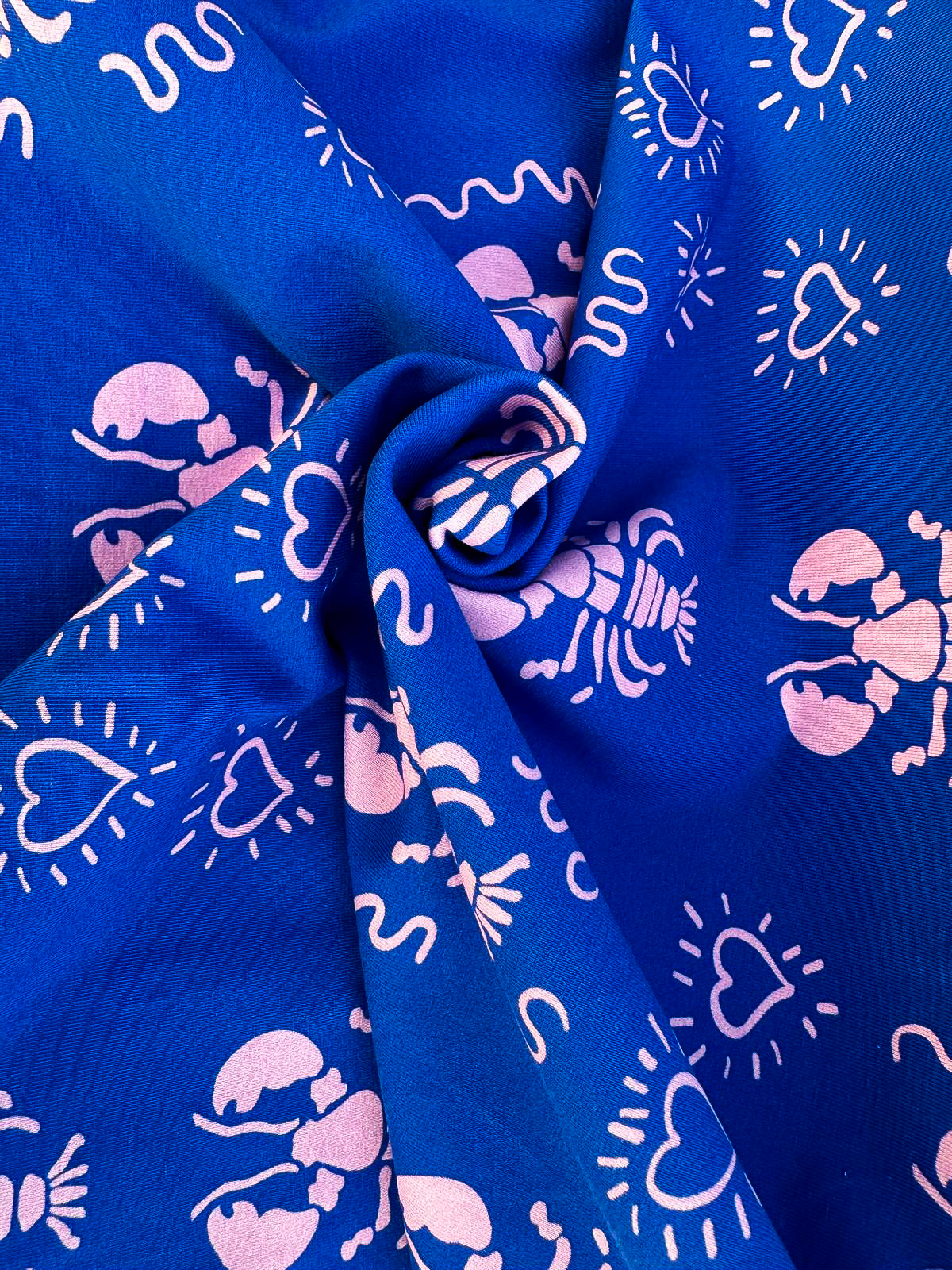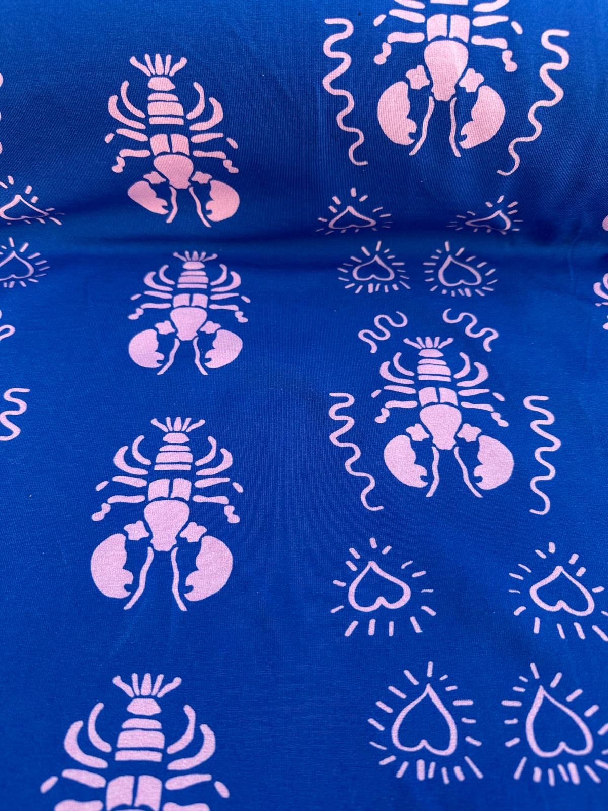 Deze opvallende katoenen stof brengt het beste van de zee naar jouw naaimachine! Met lila kreeften op een diepe kobaltblauwe achtergrond is dit design tegelijk stoer, eigenzinnig én stijlvol. Een perfecte mix van maritiem en modern.