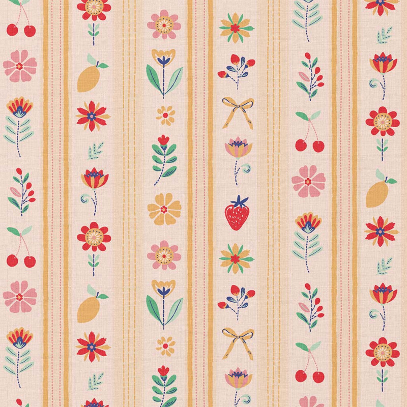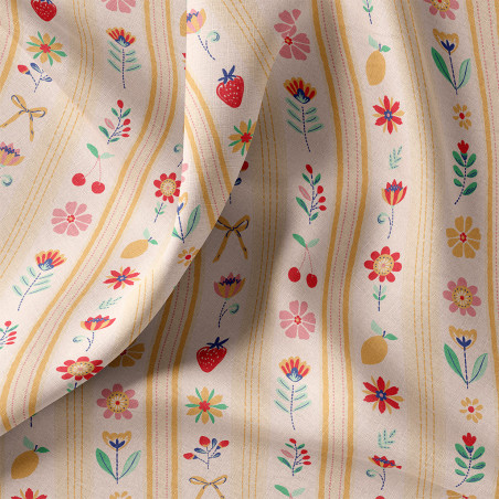 Het verticale streeppatroon zorgt voor een rustig en geordend effect, terwijl de kleine bloemmotieven en fruitige elementen zorgen voor een vrolijke en unieke uitstraling. De stof laat zich eenvoudig combineren met effen kleuren zoals crème, oudroze, jeansblauw, mosterd of saliegroen, wat eindeloze ontwerpmogelijkheden biedt.